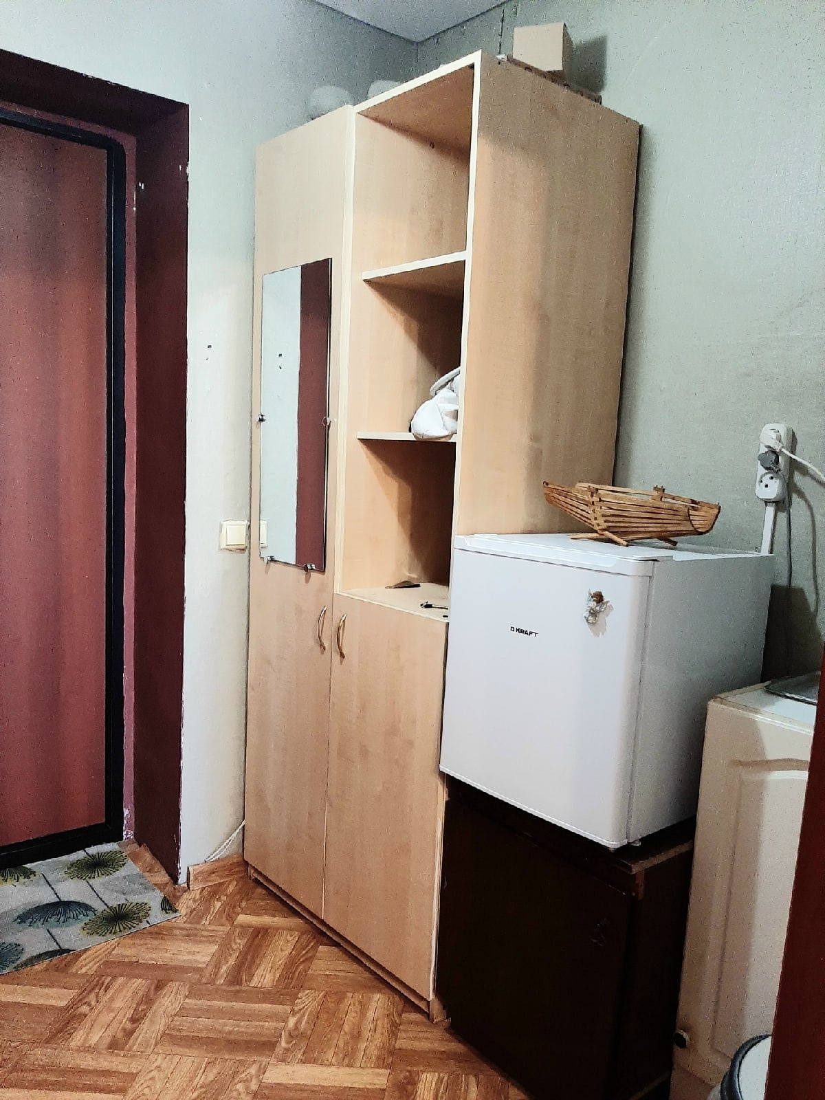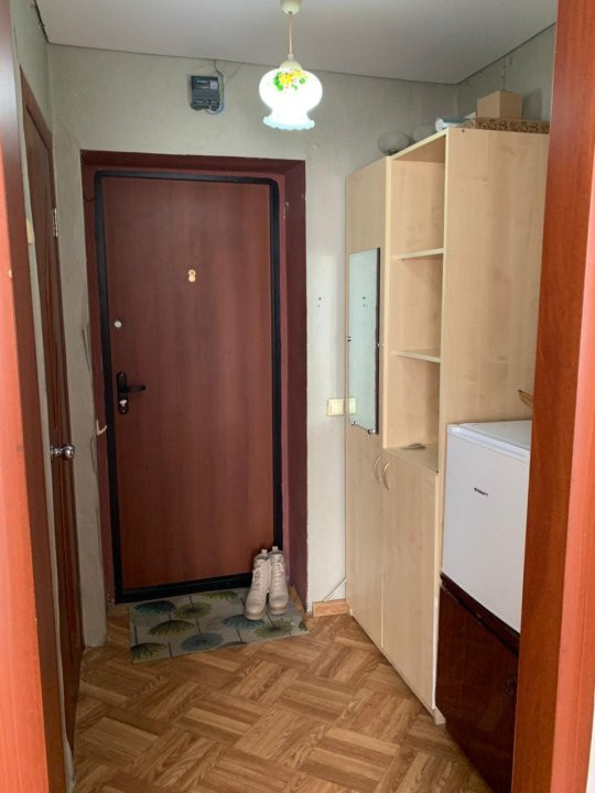 Уютная,очень теплая 1 кв.(гостинка) 17,4 кв.м. Натяжной потолок, на полу линолеум, железная дверь, горячая вода, душ в кафеле советского образца,стиральная машина, мебель. На общей кухне собственный стол,хорошая газовая плита. Можно не платить за газ и в квартире готовить на индукционной плите. Подьезды закрываются,везде освещение.В конце февраля будет 3 года в собственности.