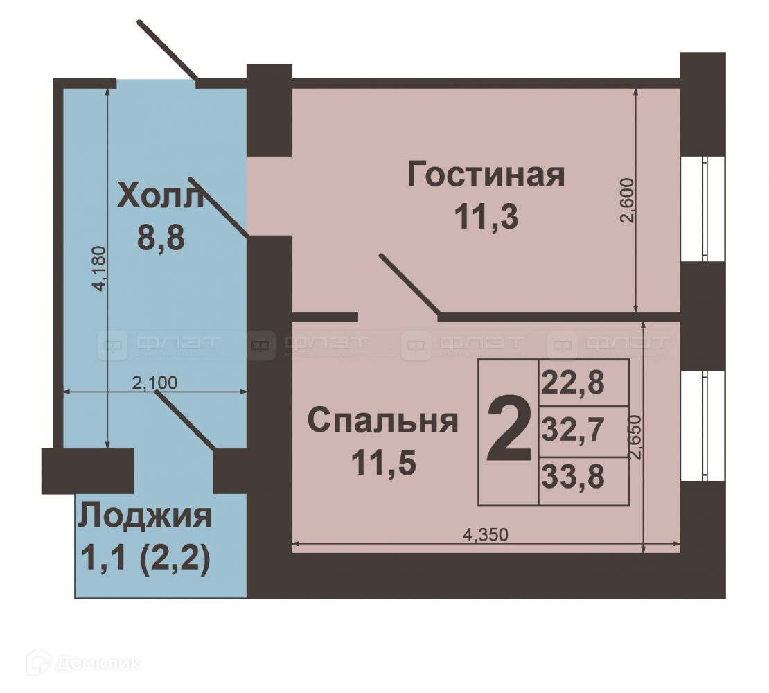 Жилая площадь 22.8 м2