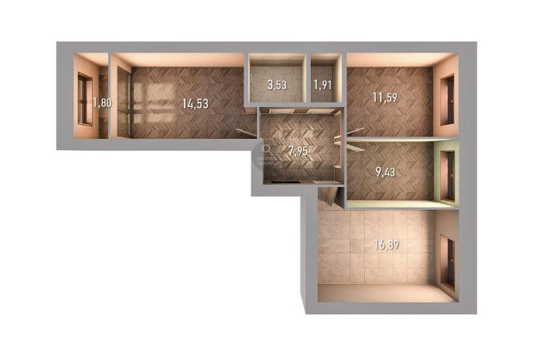 - Комнаты: 14,53 м², 11,59 м², 9,43 м²
