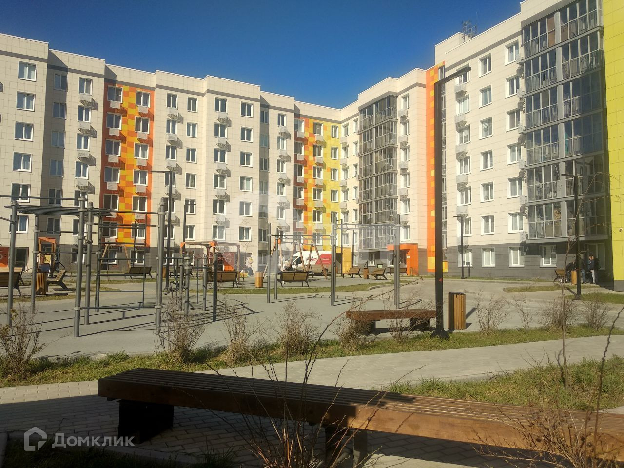 Комфортный и красивый двор без машин, современная воркаут-зона, наземный паркинг на 556 машиномест, безбарьерная среда, светлые подъезды, колясочные и смарт-планировки.