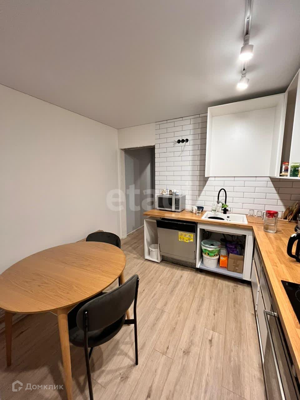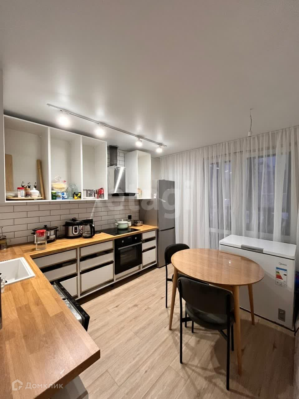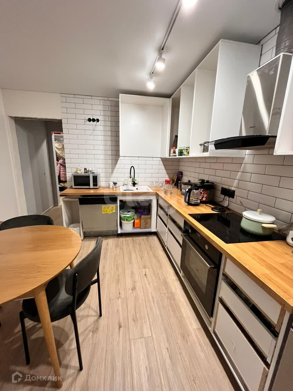 Новым хозяевам остается вся встроенная мебель и кухня, причем фасады можете выбрать под себя на свой вкус.