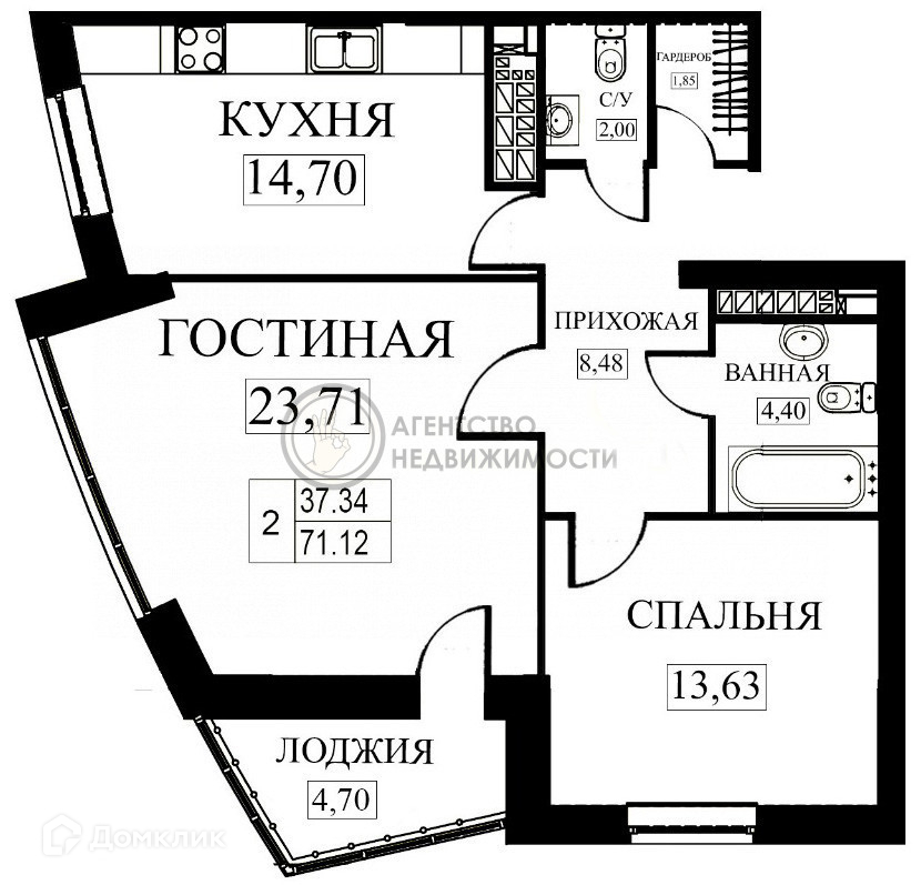 Просторная кухня (14,70 м2), гардеробная (1,85 м2),
