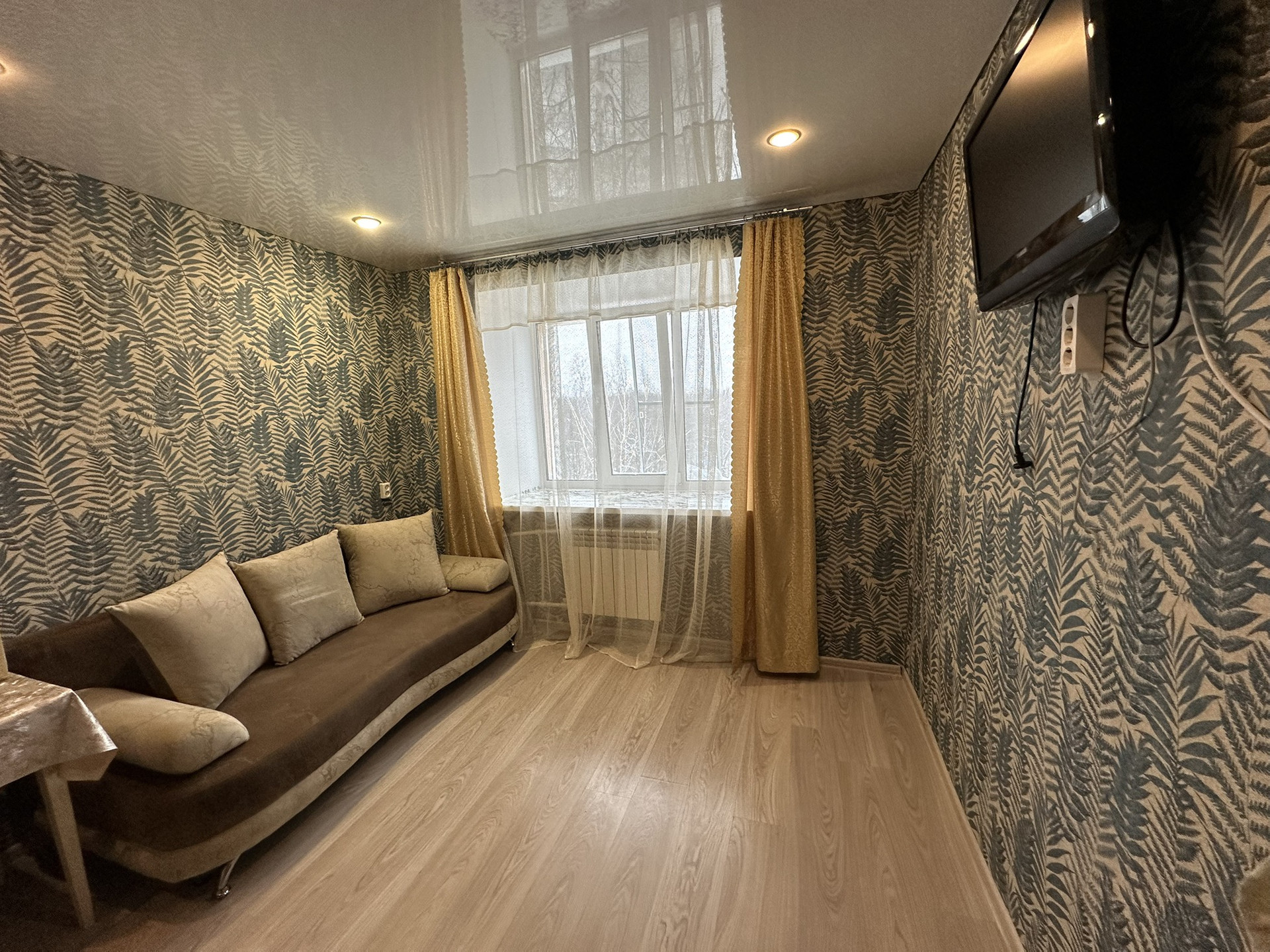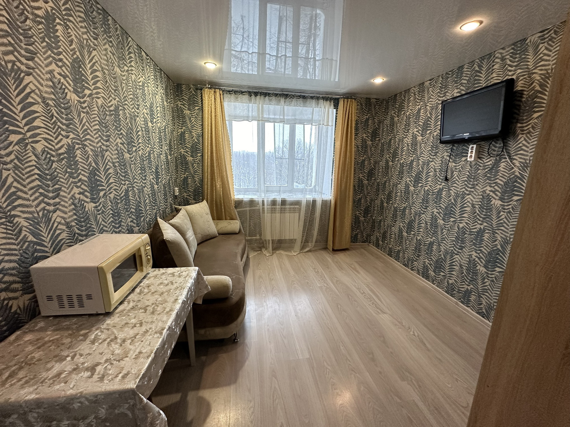 Общая жилая площадь 12,1 м2, имеется стиральная машинка, телевизор, холодильник, шкаф, диван.