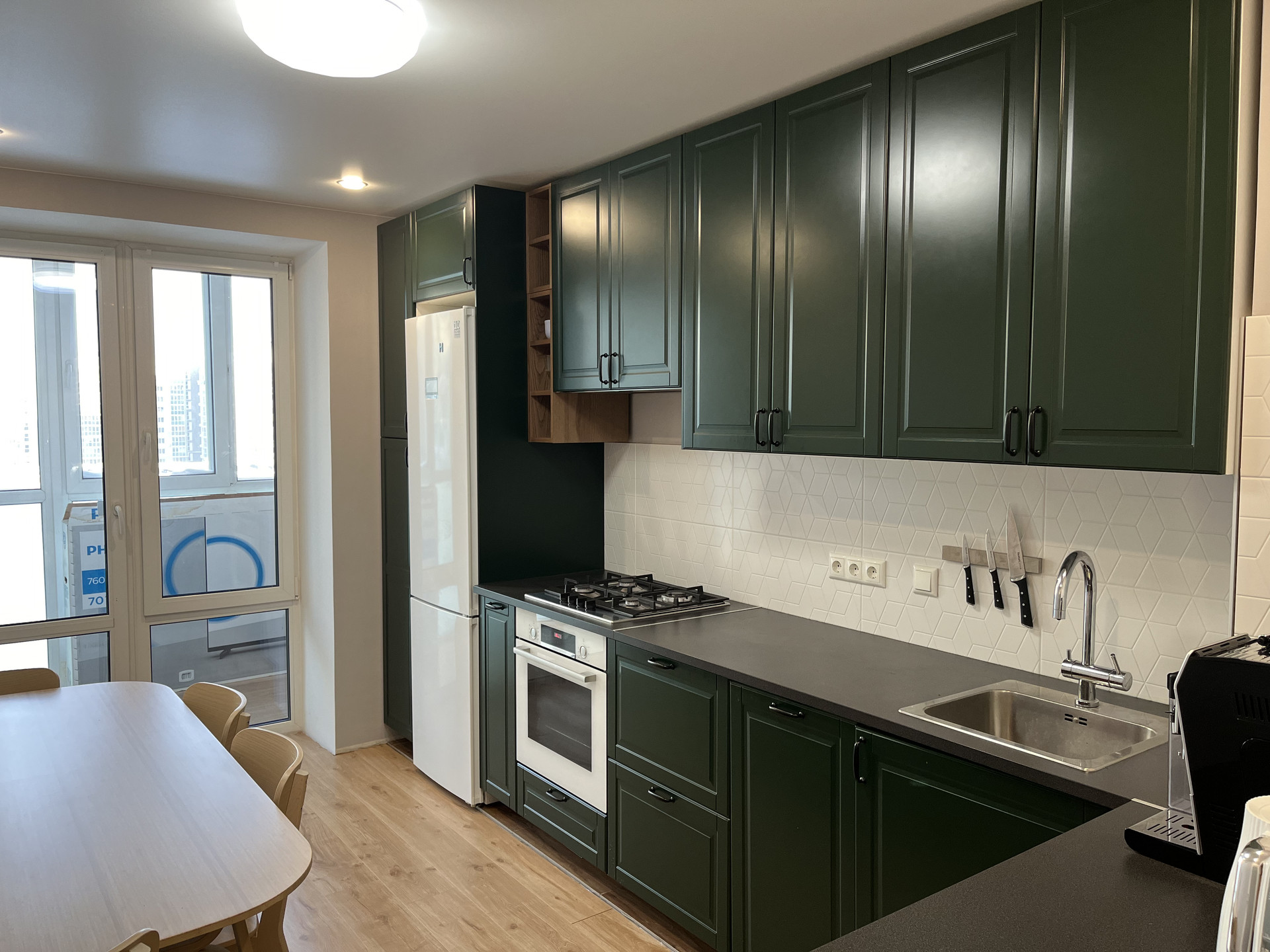 Кухня Икея с эмалевыми фасадами. Установлен фильтр с обратным осмосом для питьевой воды.