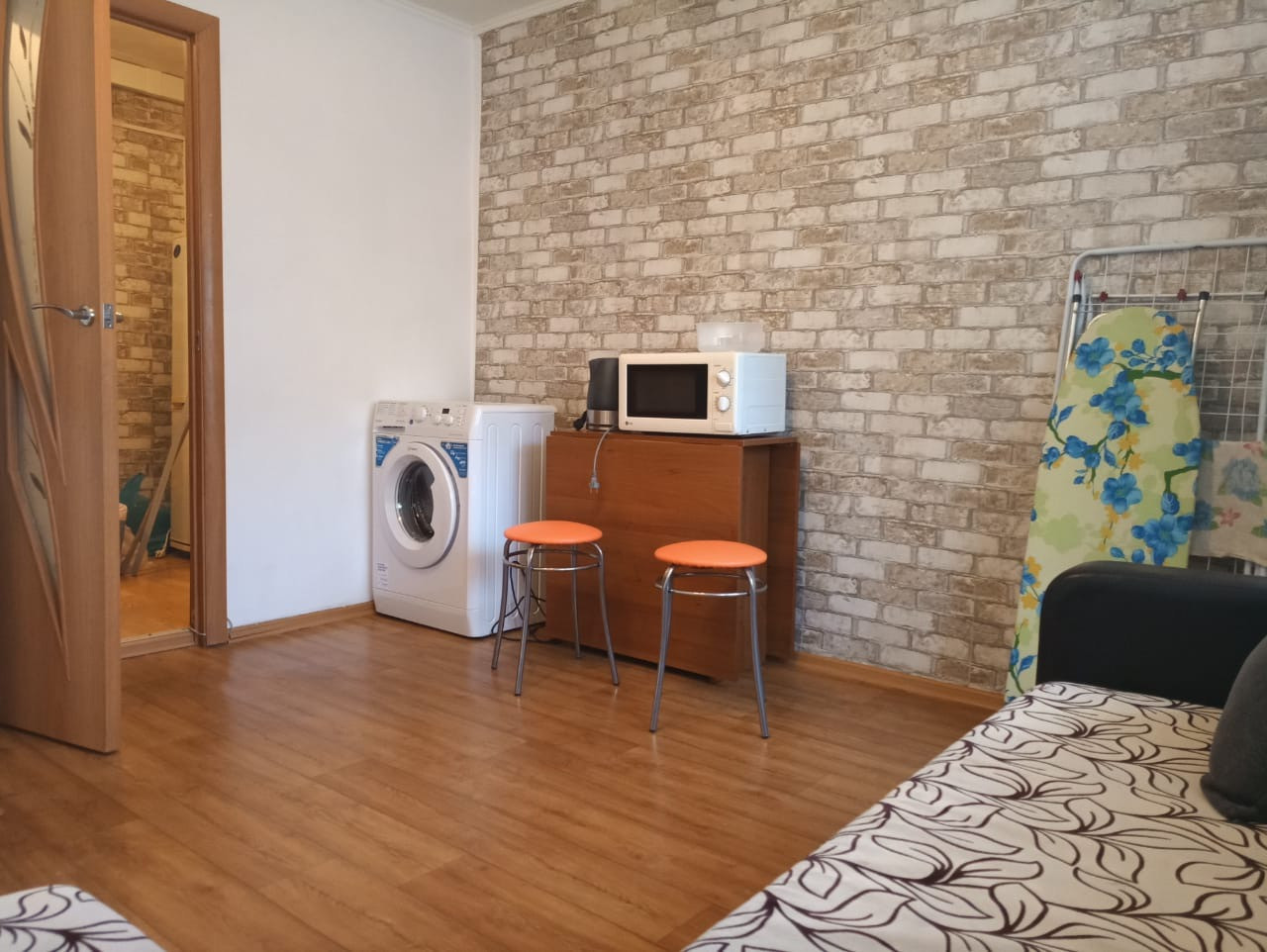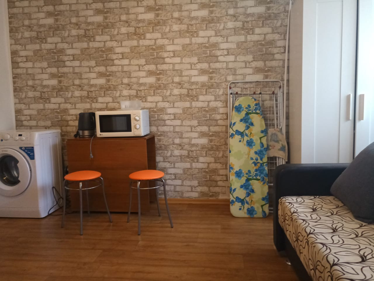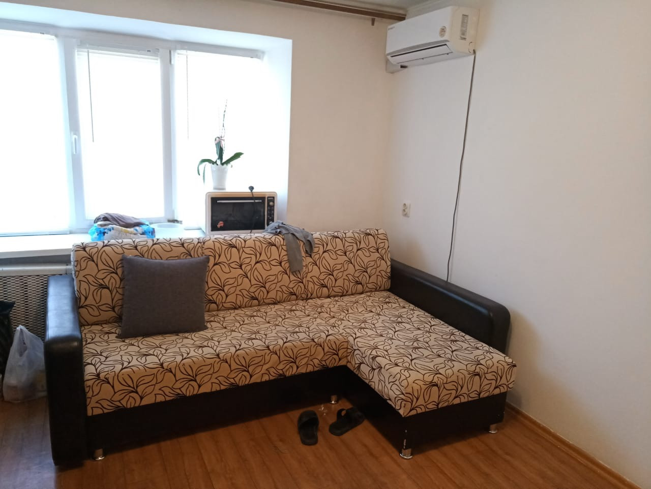 В квартире сделан ремонт: стены под покраску и обои. На кухне: кухонный гарнитур, холодильник. В комнате: диван, стол и стулья, стиральная машина и шкафы. Установлен кондиционер. Сан узел обшит панелями, душевой поддон, установлен большой водонагреватель.