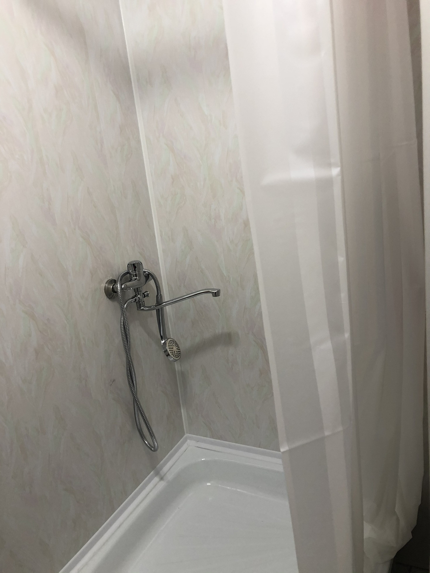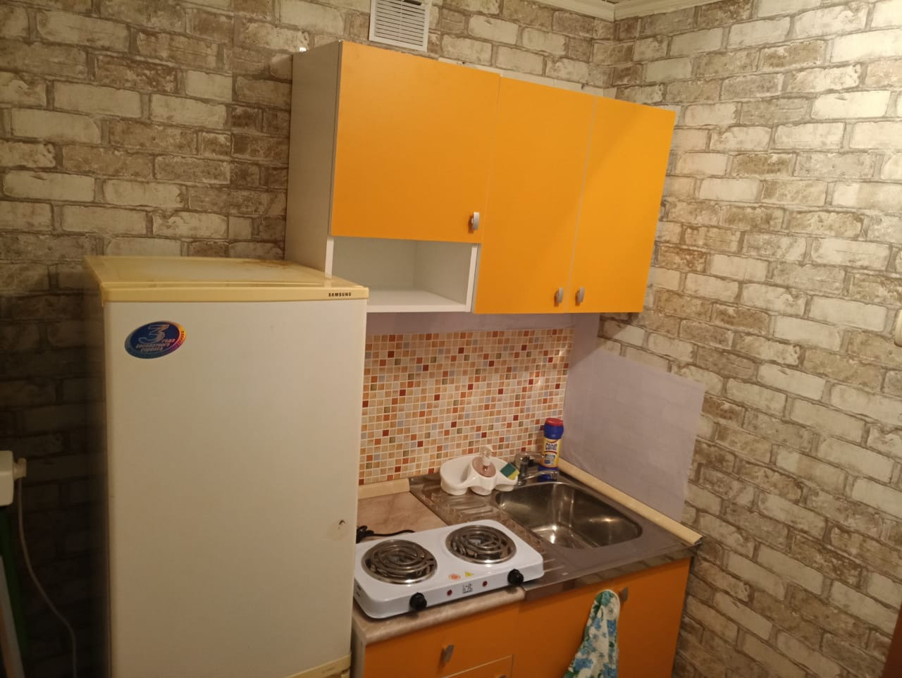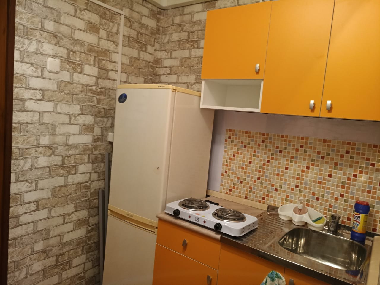 В квартире сделан ремонт: стены под покраску и обои. На кухне: кухонный гарнитур, холодильник. В комнате: диван, стол и стулья, стиральная машина и шкафы. Установлен кондиционер. Сан узел обшит панелями, душевой поддон, установлен большой водонагреватель.