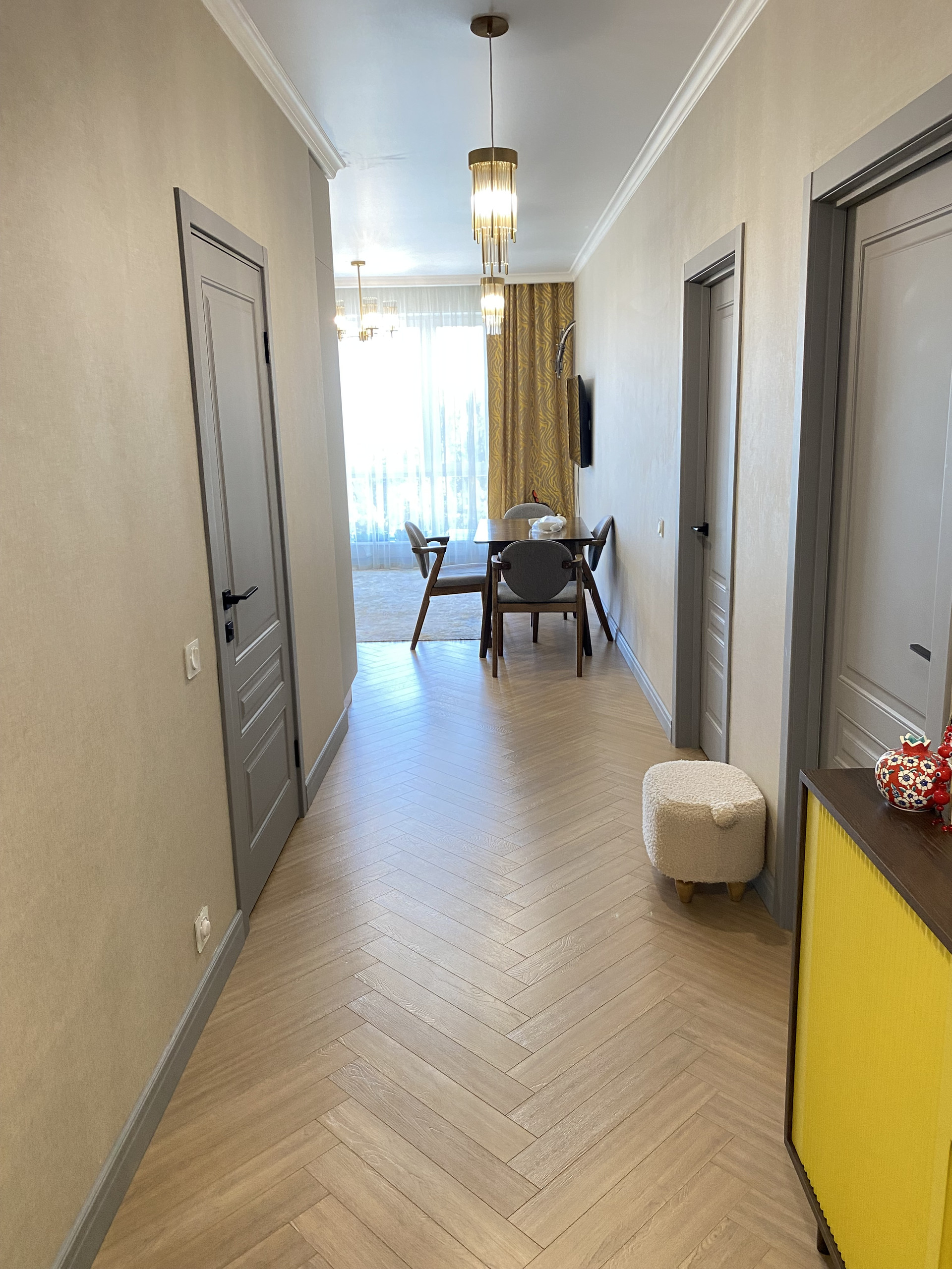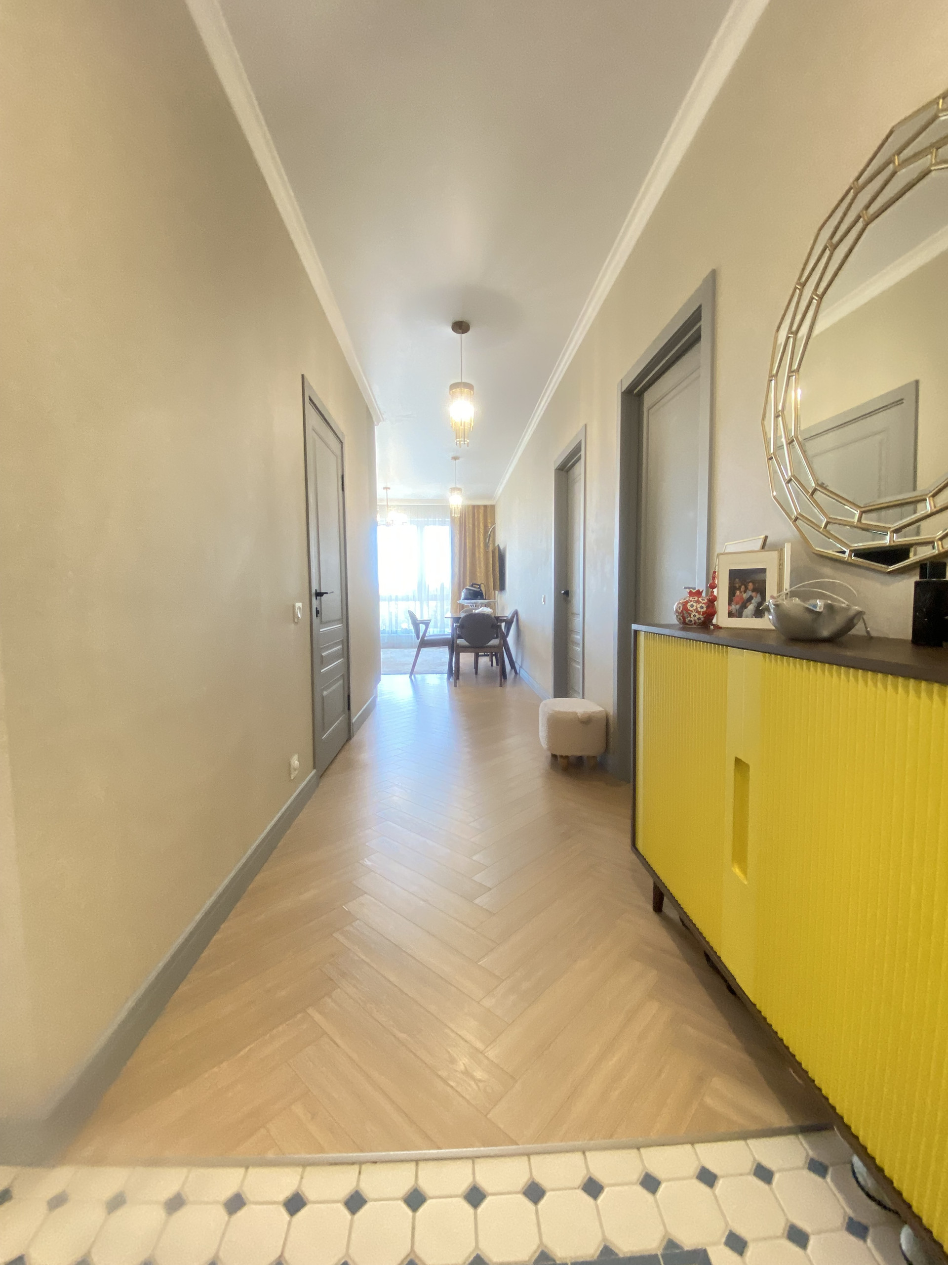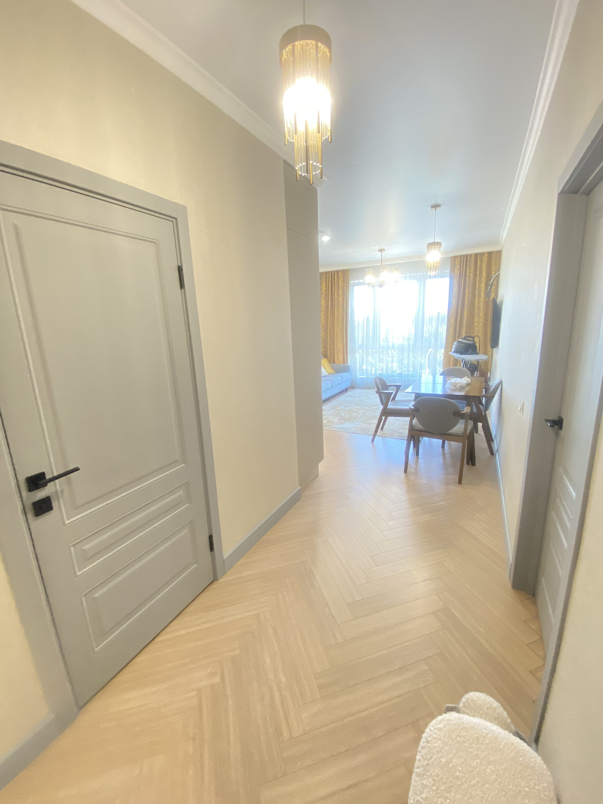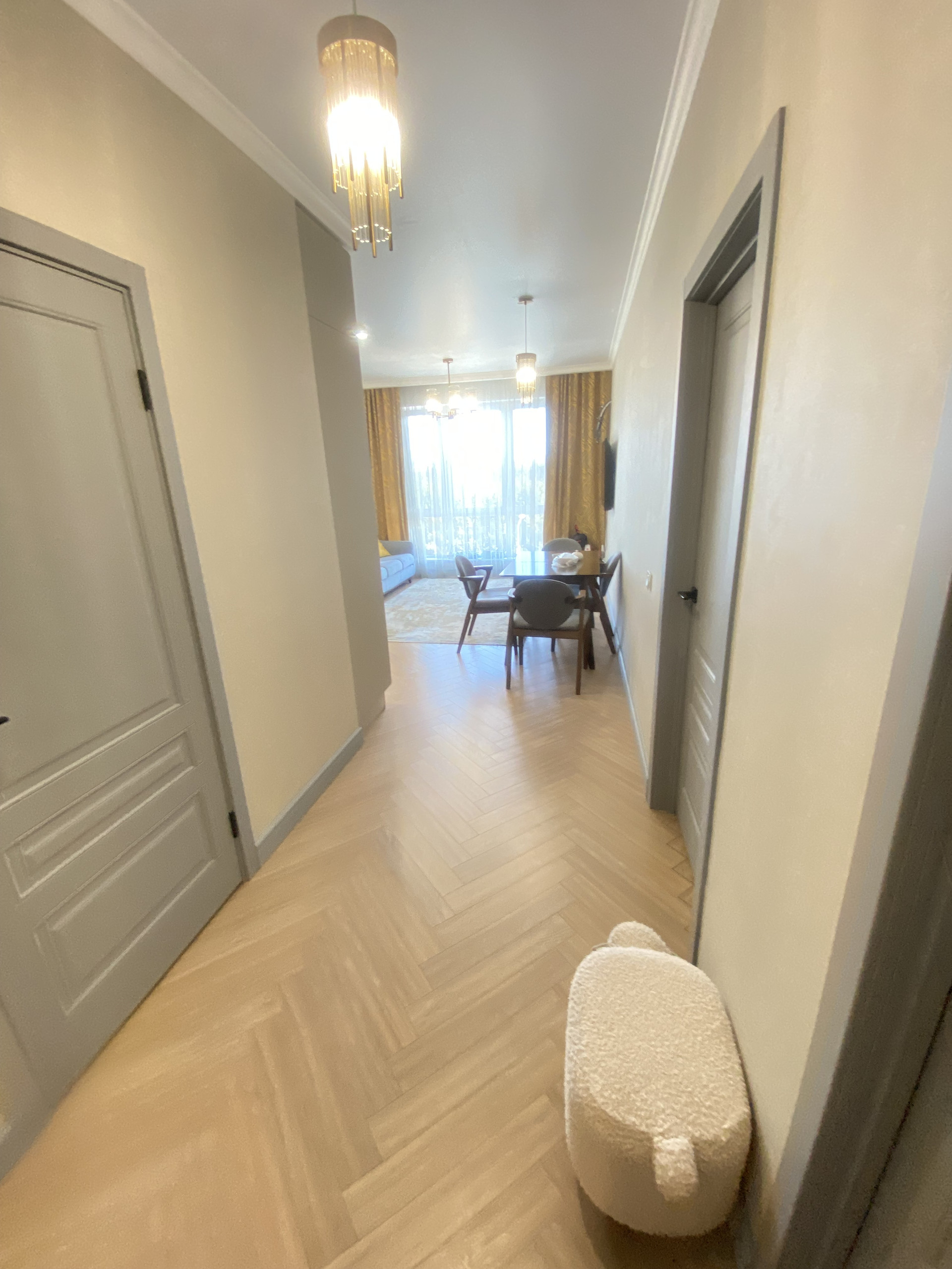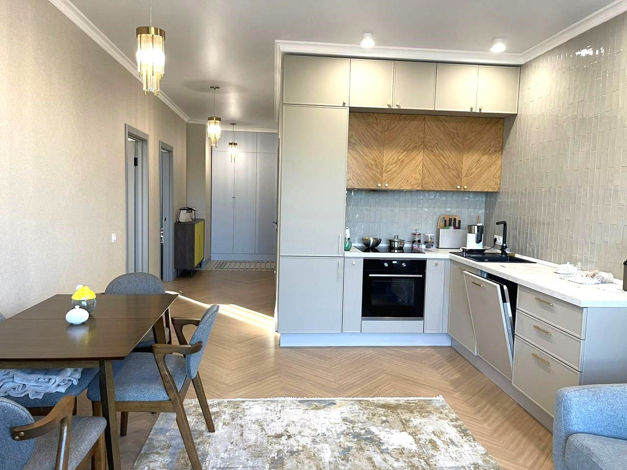 Общая площадь квартиры составляет 70 кв.м. Квартира состоит из двух раздельных комнат, просторной кухни-гостиной, совмещенного санузла и балкона с выходом из детской комнаты. Квартира очень светлая, с отличным качественным ремонтом, полностью готова к проживанию.  В стоимость квартиры входит кухонный гарнитур со встроенной техникой, а также вместительный шкаф купе в прихожей.