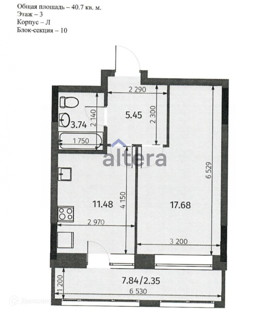 Общая площадь 40.7 м2