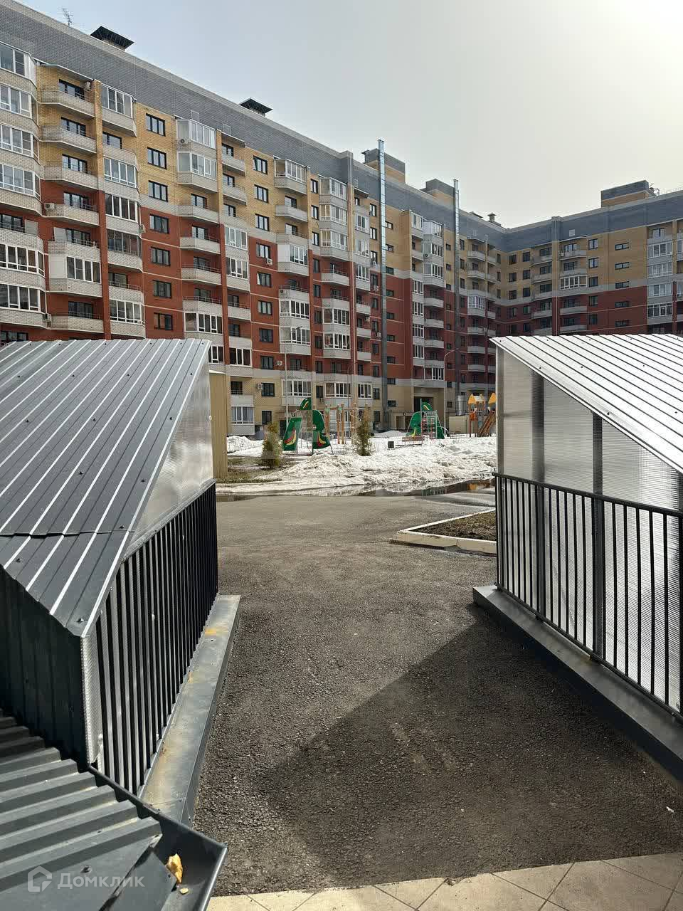 Закрытый двор без машин. Въезд на территорию дома через шлагбаум.