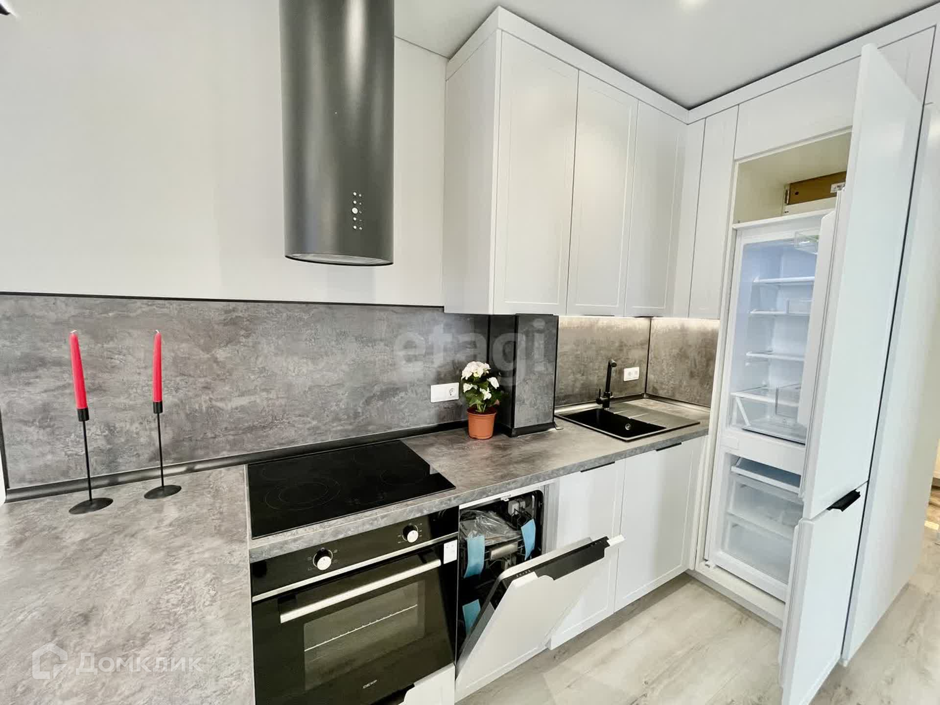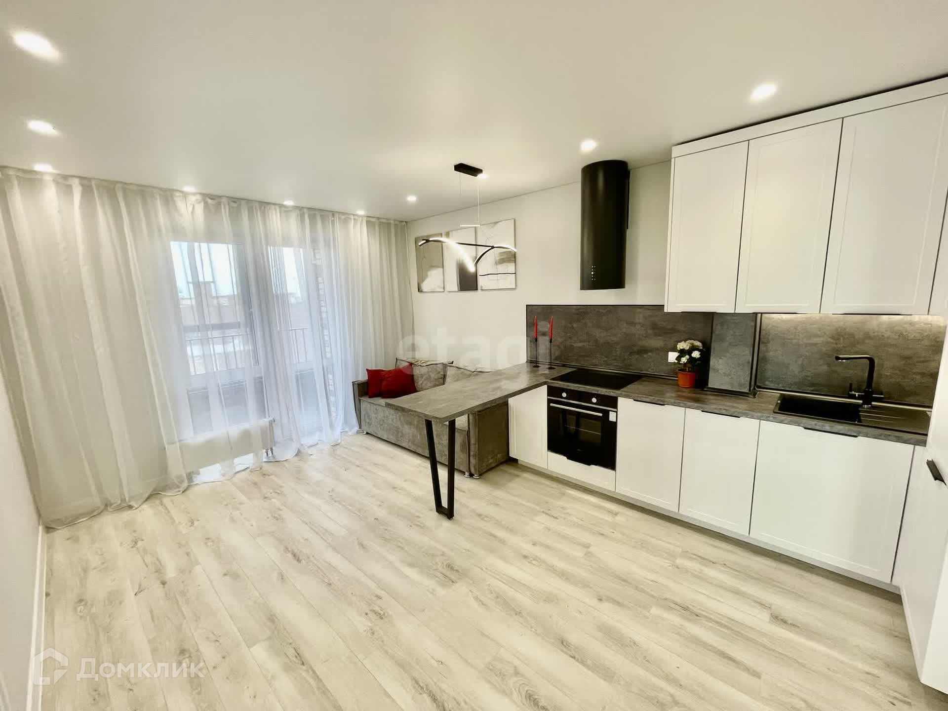 - кухня-гостиная 17 кв.м. с кухонным гарнитуром со встроенной техникой (холодильник, посудомоечная машина, духовой шкаф, варочная панель, вытяжка), диваном и выходом на панорамную лоджию с шикарным видом во двор;