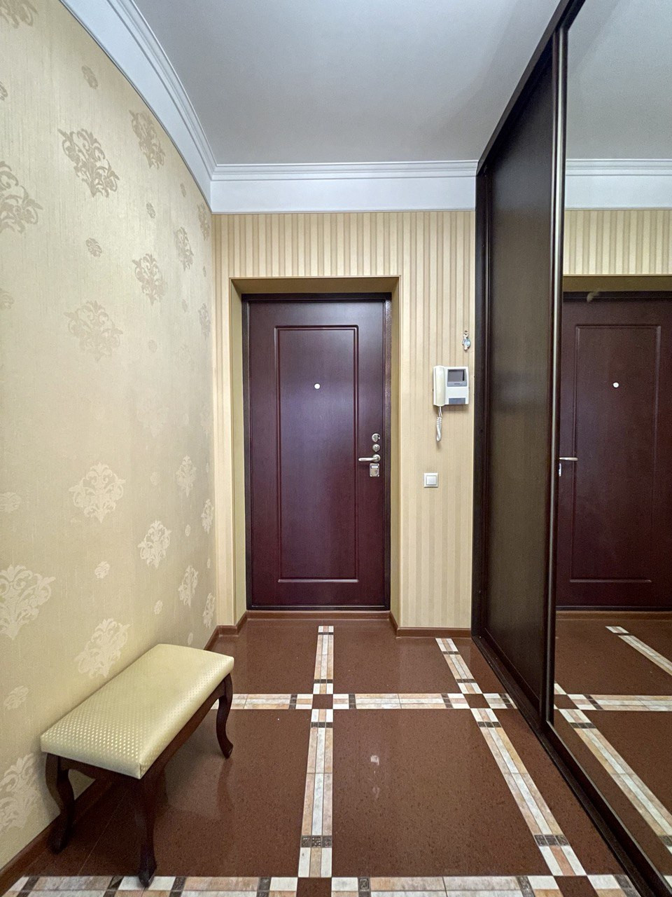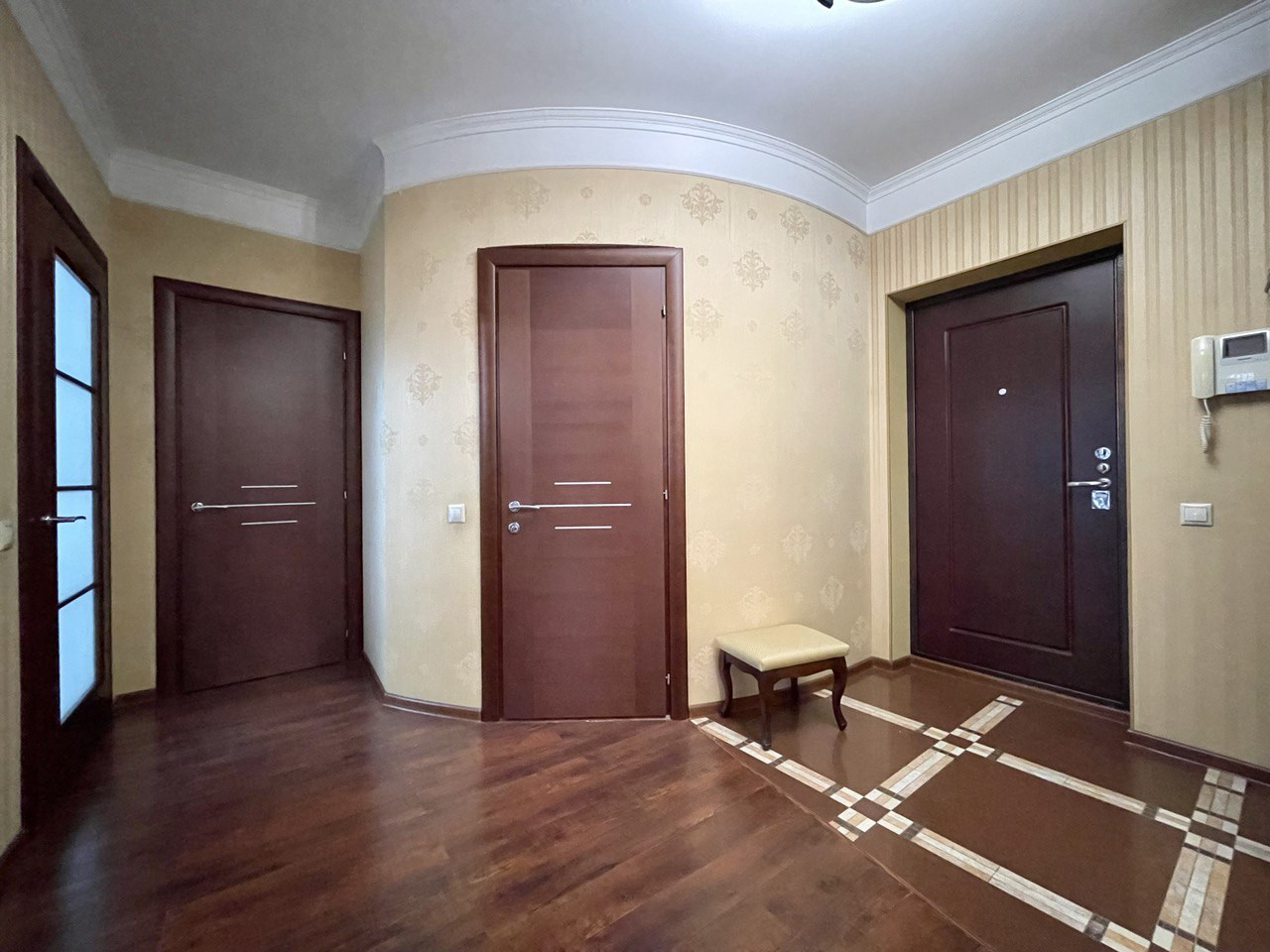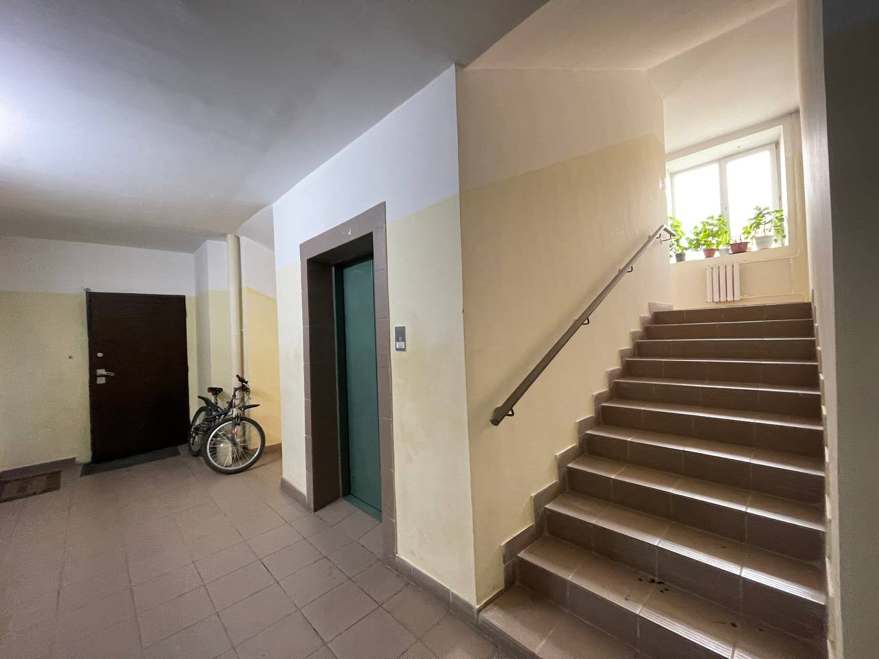 В квартире выполнен качественный ремонт, на полу плитка и ламинат, на стенах обои, добротные двери. Просторные комнаты, высокие потолки 2,8 м, окна выходят в тихий двор с видом на прилегающую зеленую территорию и город!