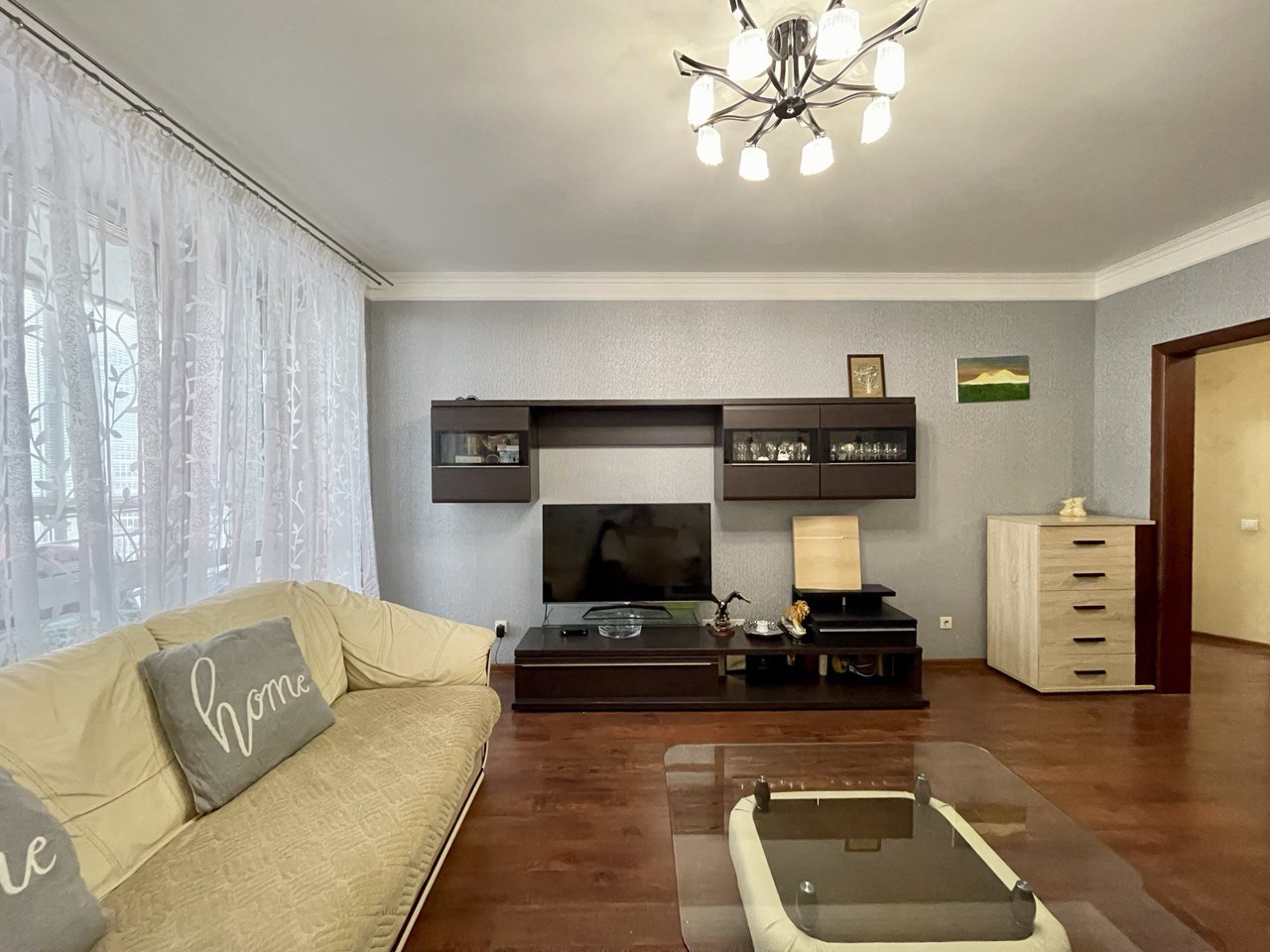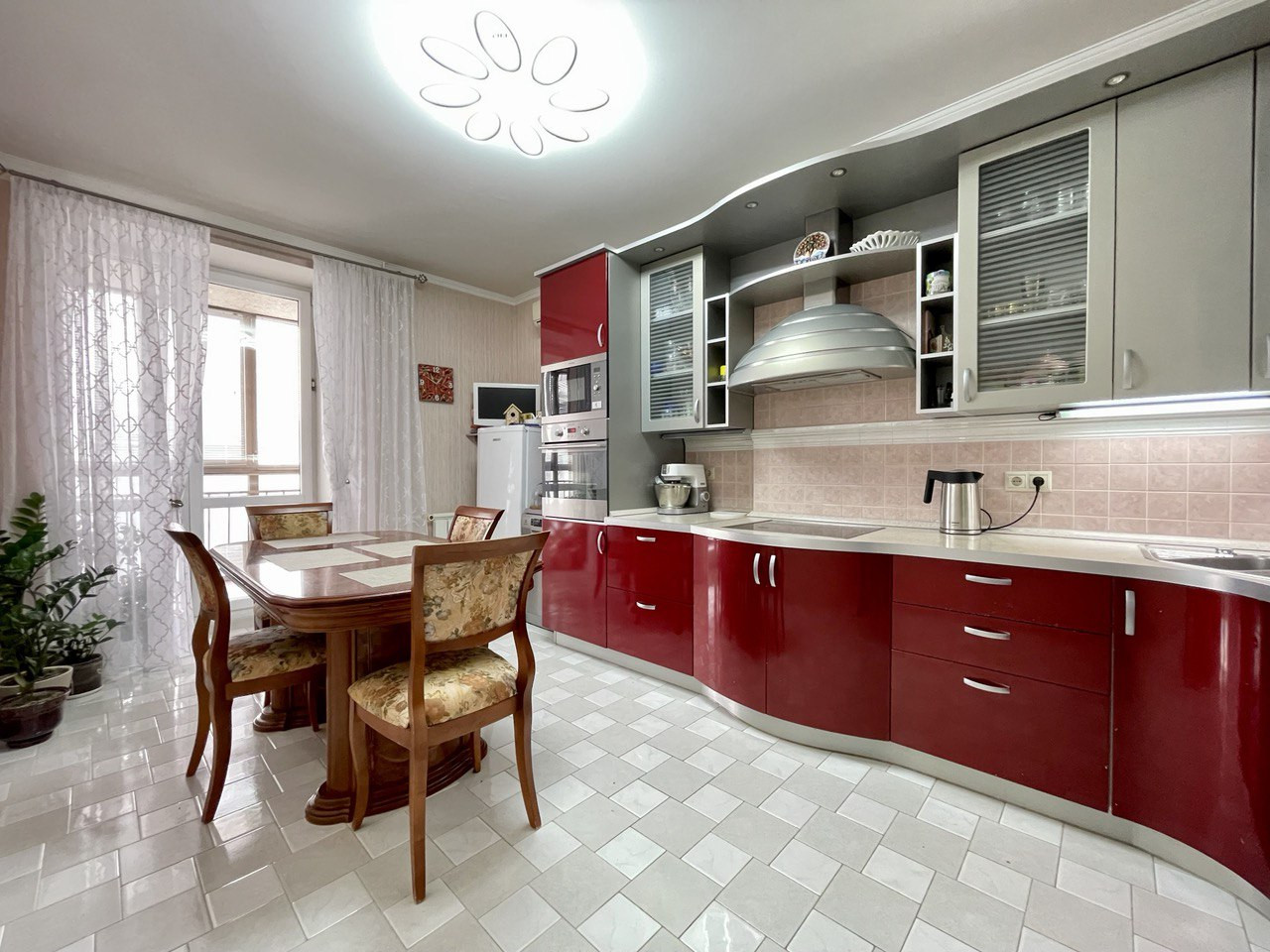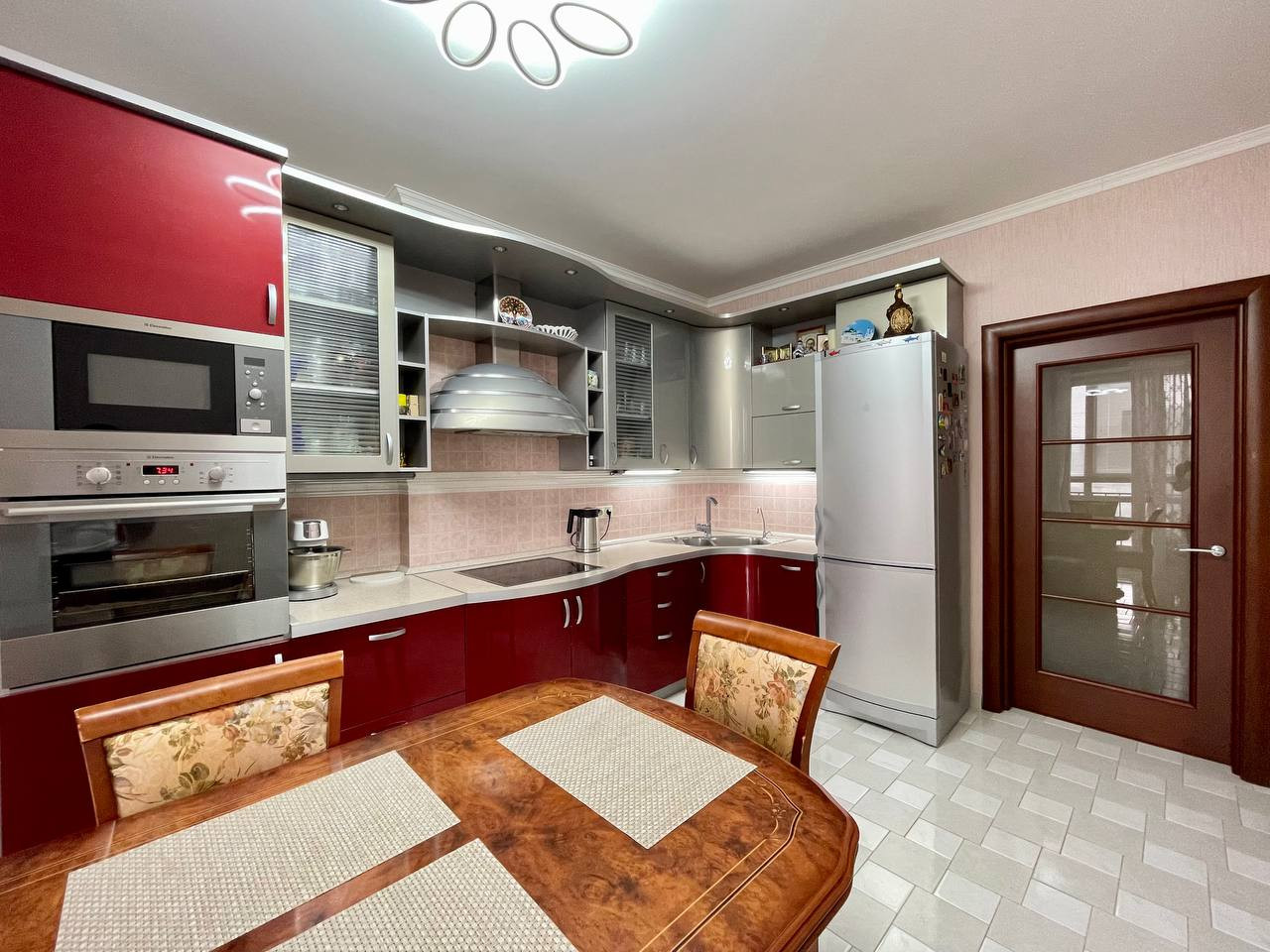 В квартире выполнен качественный ремонт, на полу плитка и ламинат, на стенах обои, добротные двери. Просторные комнаты, высокие потолки 2,8 м, окна выходят в тихий двор с видом на прилегающую зеленую территорию и город!