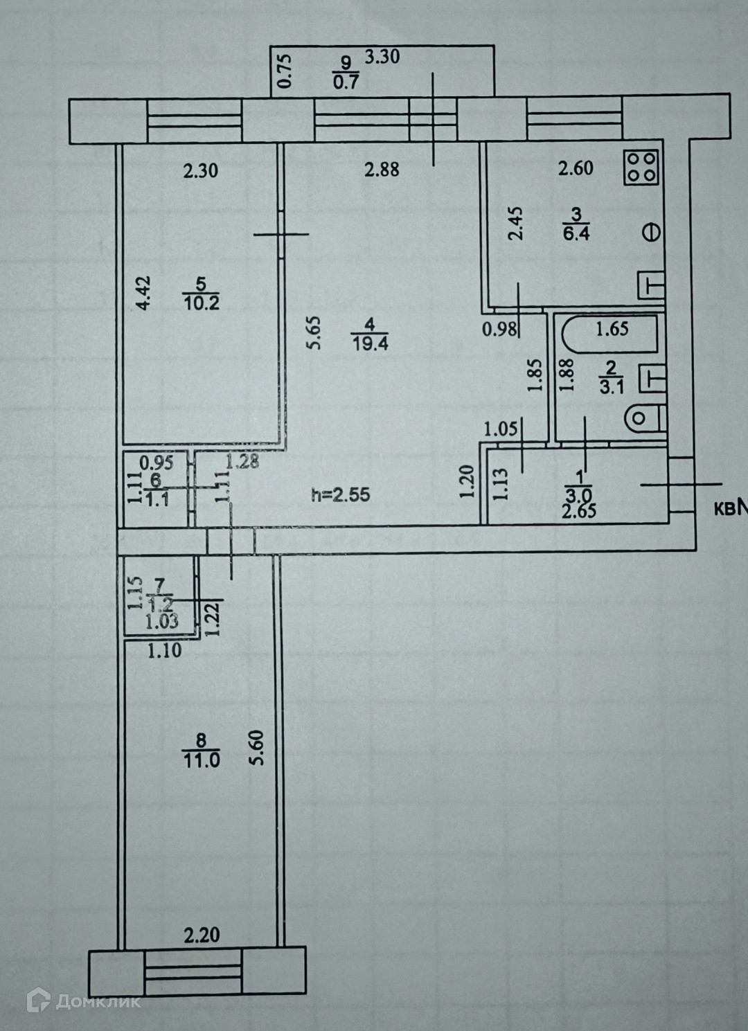 Общая площадь 55.4 м2