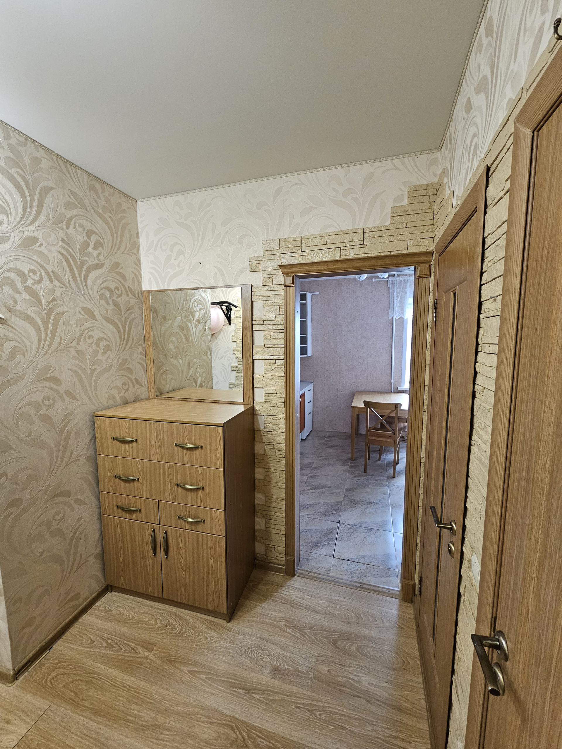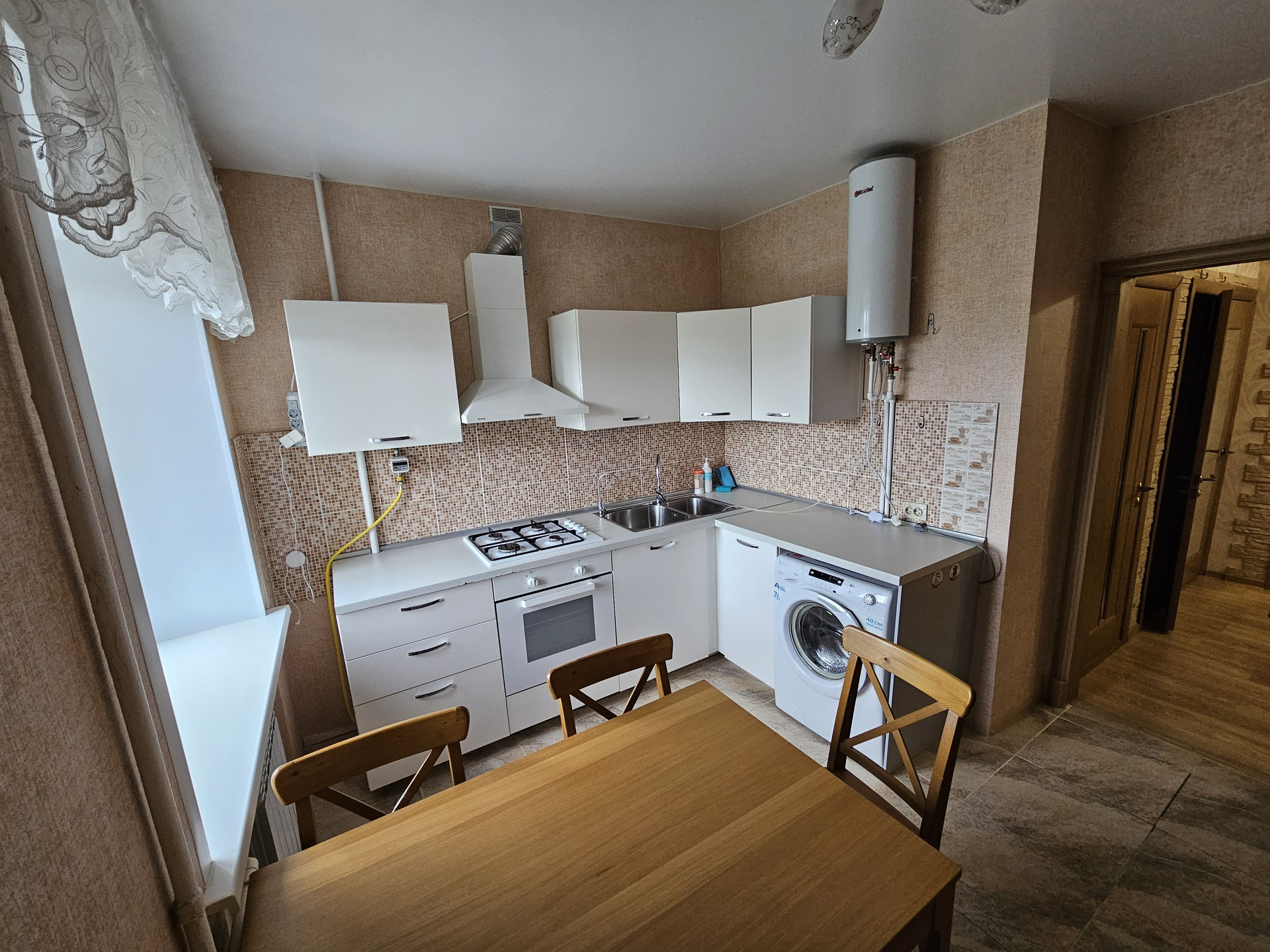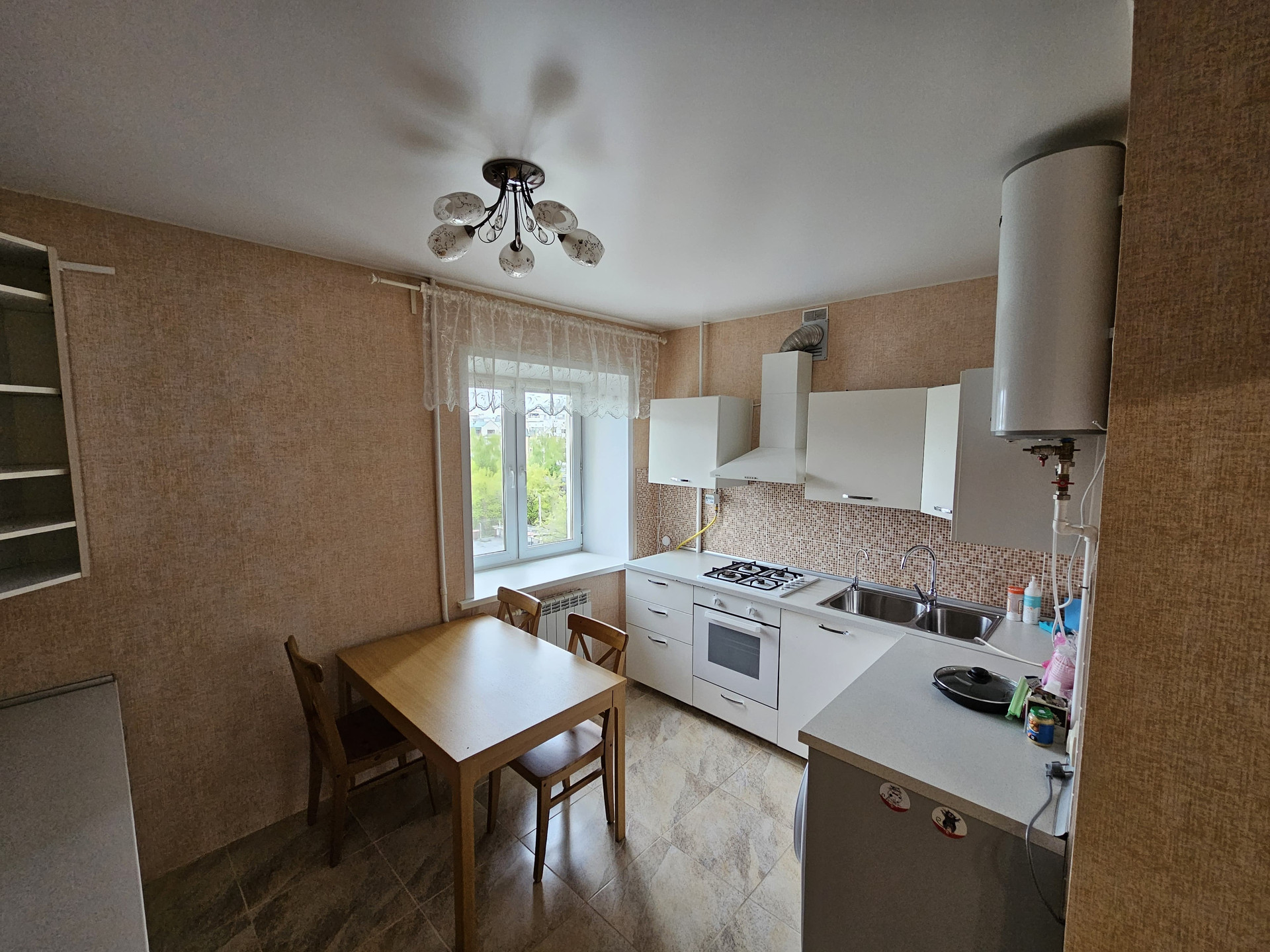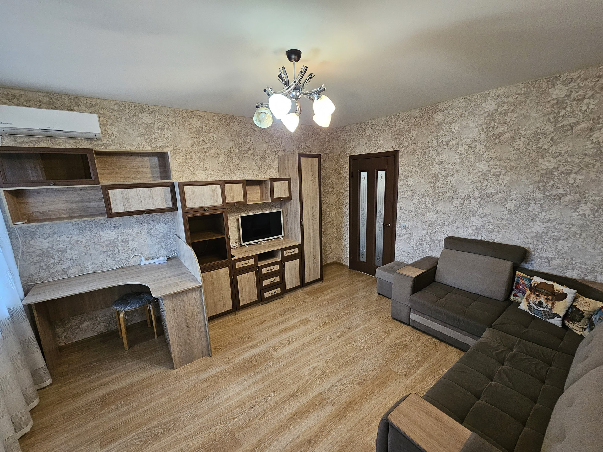 По желанию покупателей остается мебель: угловой диван, двухспальная кровать, кровать поменьше, стенка, письменный стол, полностью кухонная мебель.