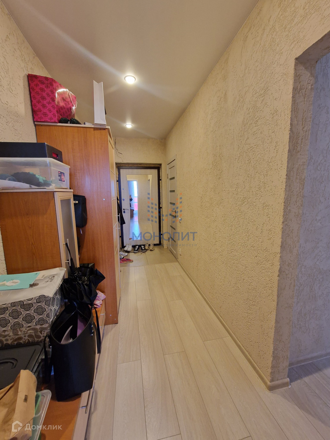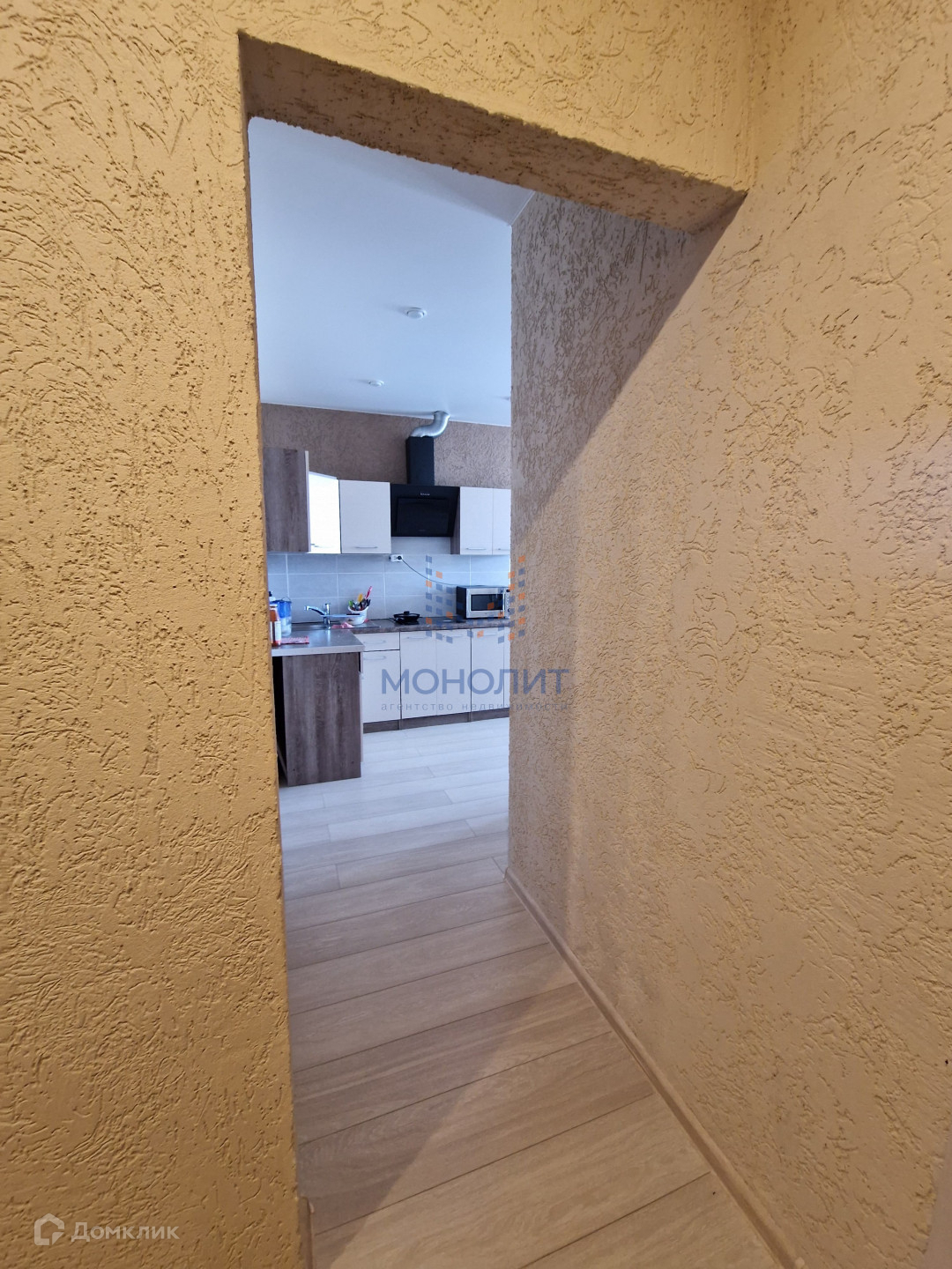 Выполнен ремонт в светлых тонах, на полу ламинат, стены - декоративная штукатурка.