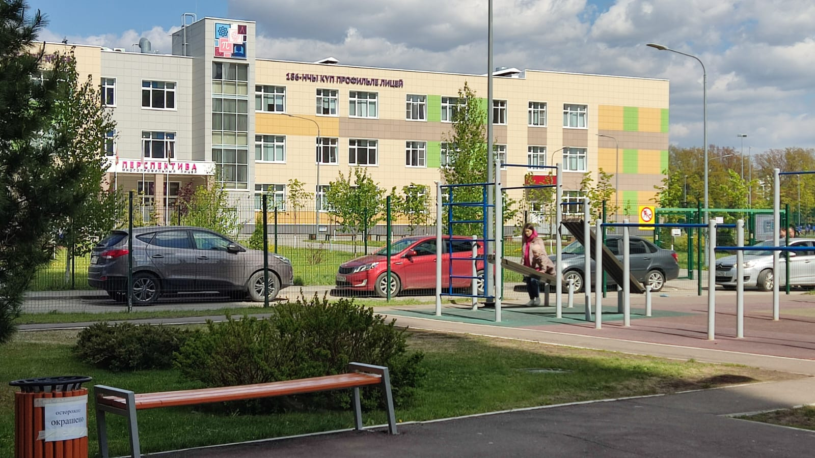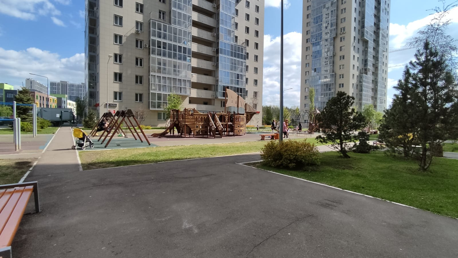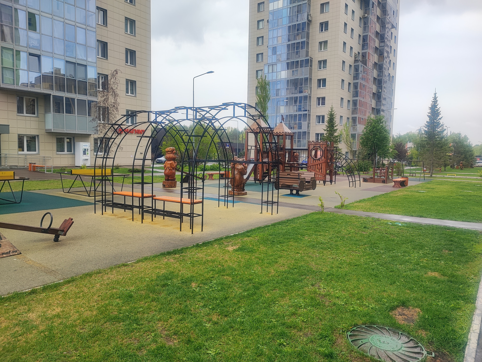 Территория двора закрыта (без машин). Современная детская площадка.