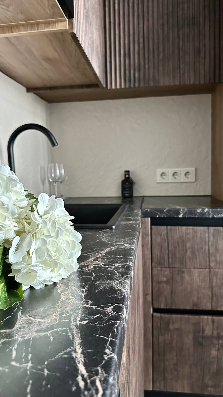 Кухня выполнена на заказ со встроенной немецкой техникой (посудомоечная машинка, микроволновка , холодильник , варочная индукционная плита , вытяжка, духовка)