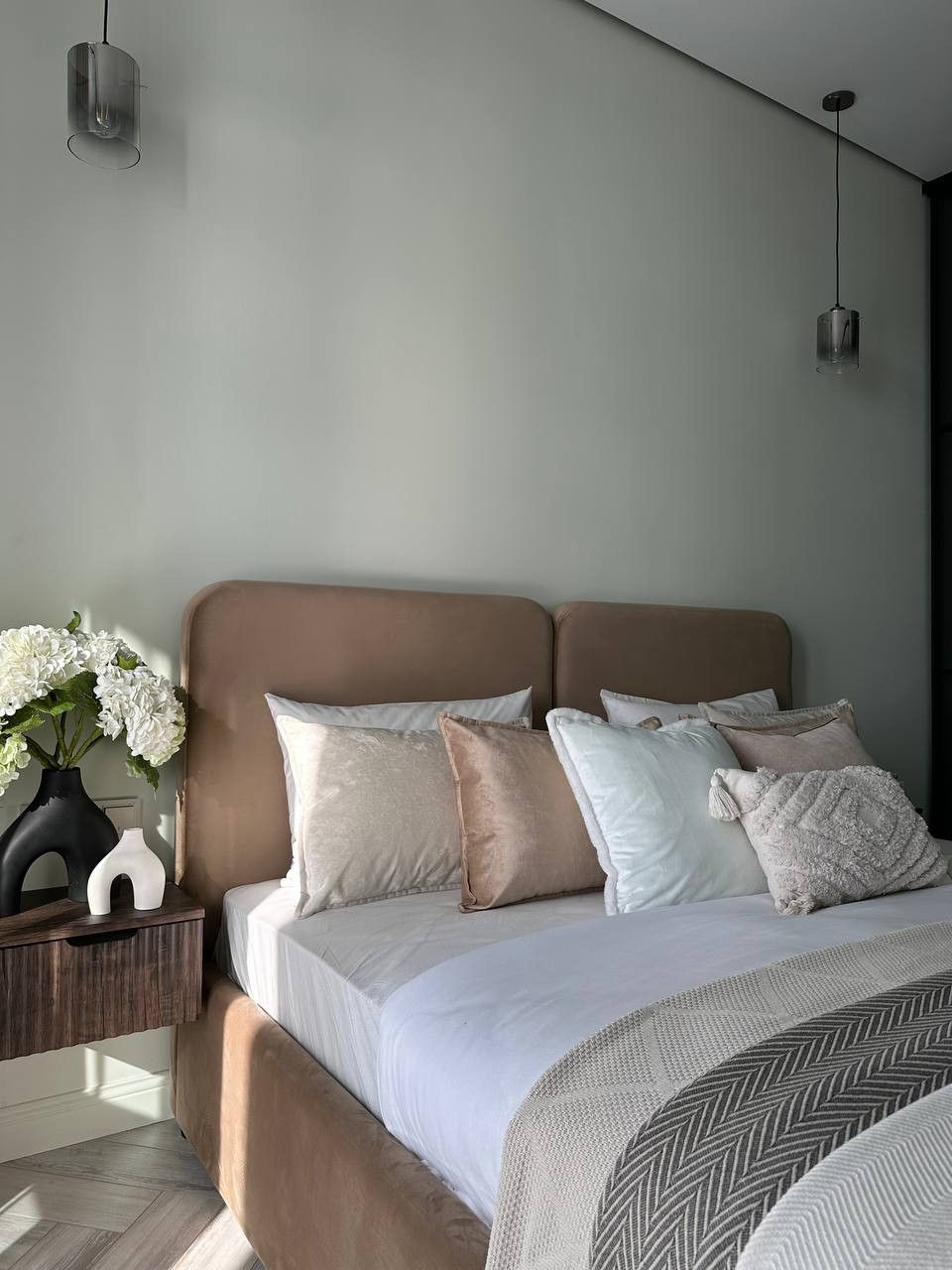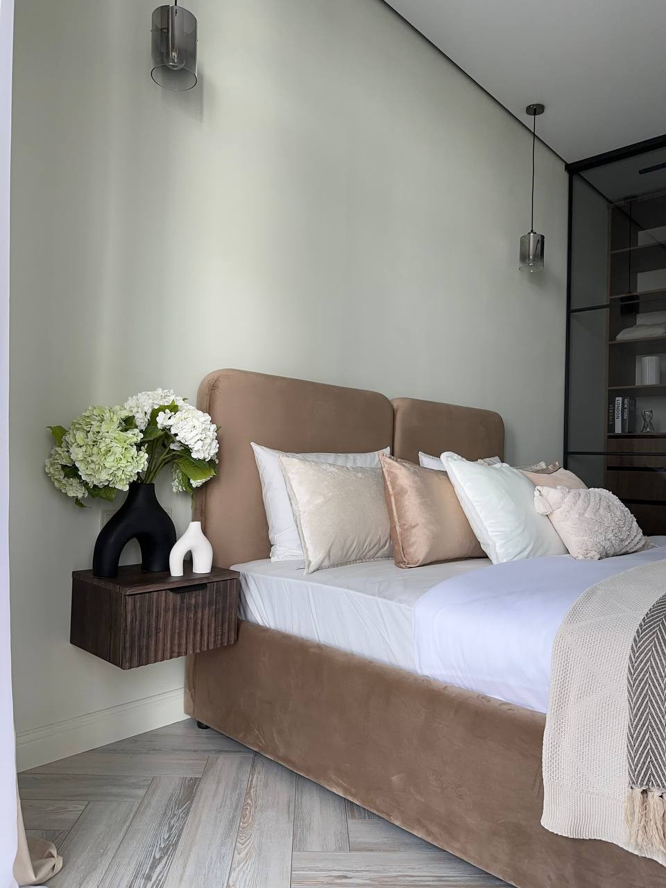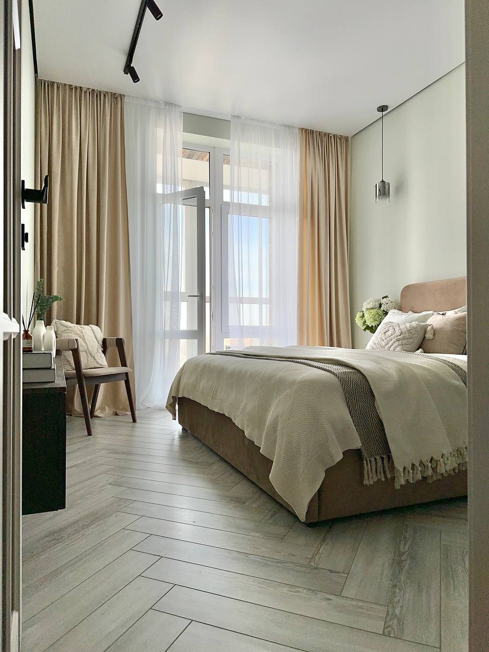 В спальне паркетная доска, постелена елочкой.