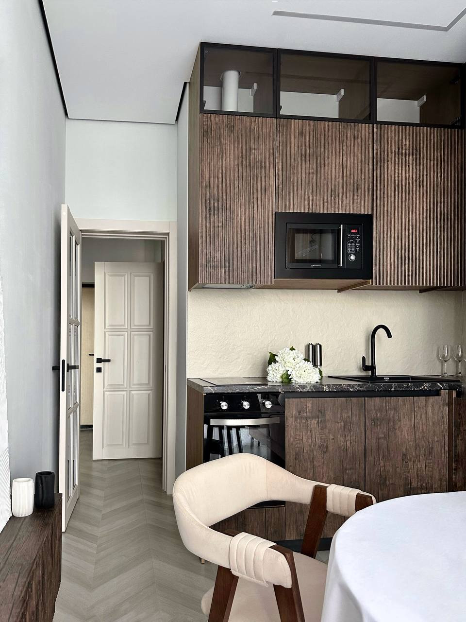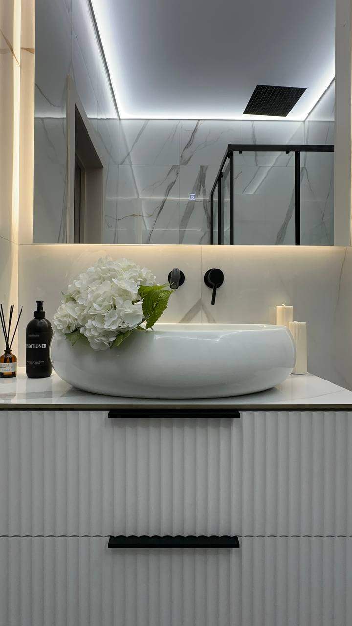 Дизайнерский ремонт, закончен в середине марта 2024 года, вся мебель выполнена на заказ для этой квартиры, керамогранит елочкой в прихожей, на кухне , на лоджии , в санузле, теплый пол под всем керамогранитом (4 датчика теплого пола).