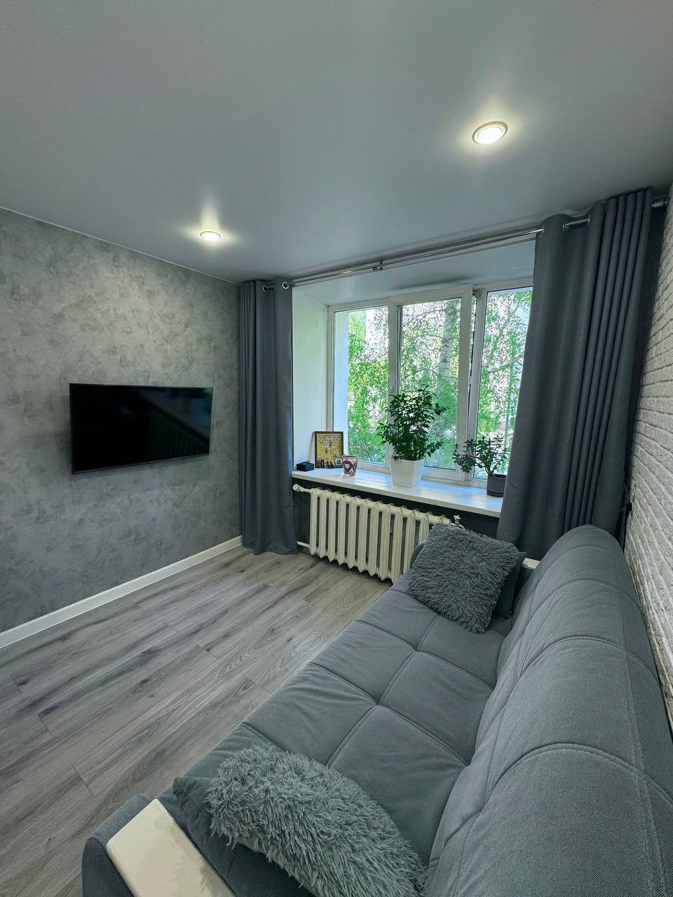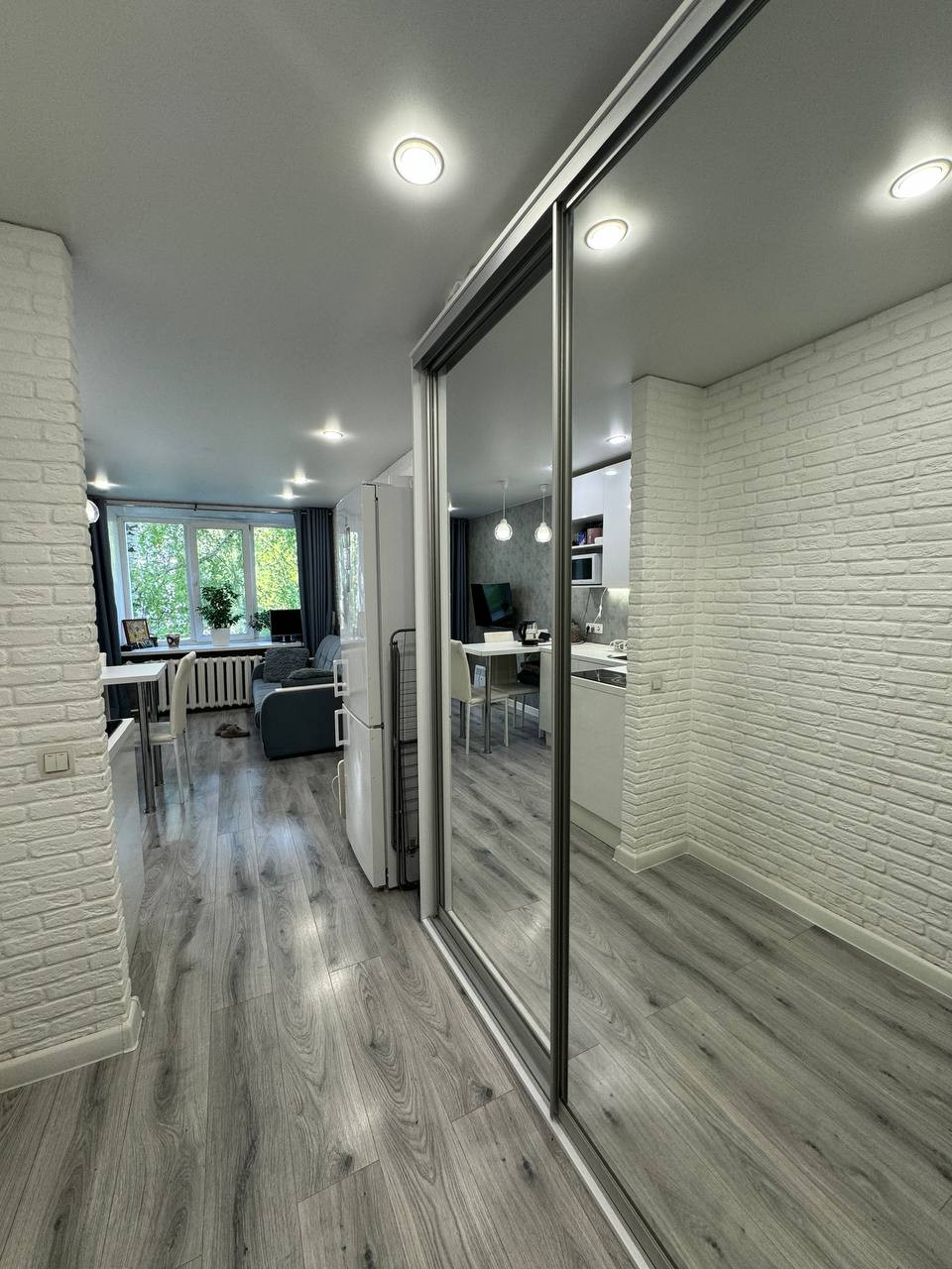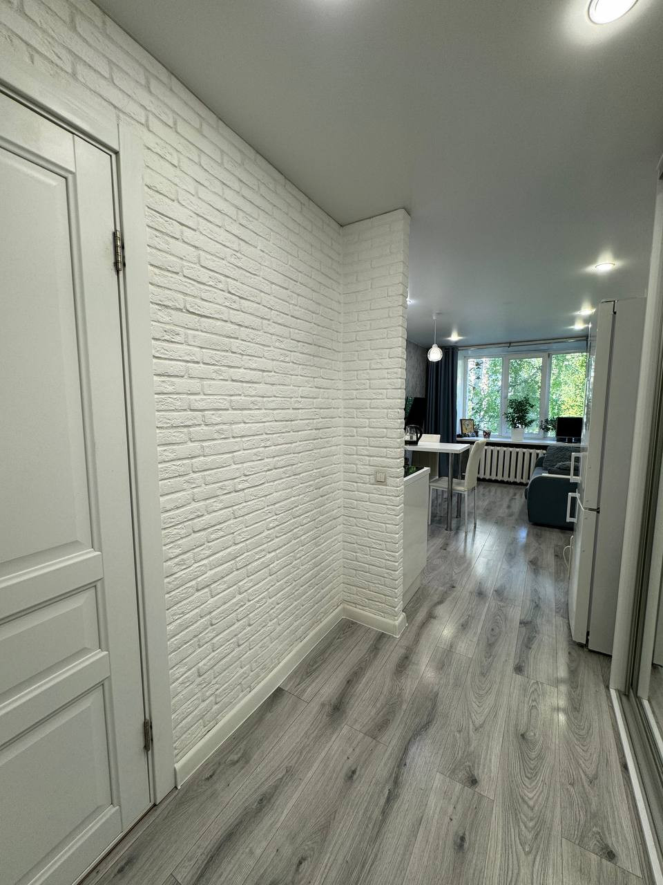 В квартире натяжной потолок, обои, декоративный кирпичик, ламинат, плитка в санузле, заменена вся проводка.