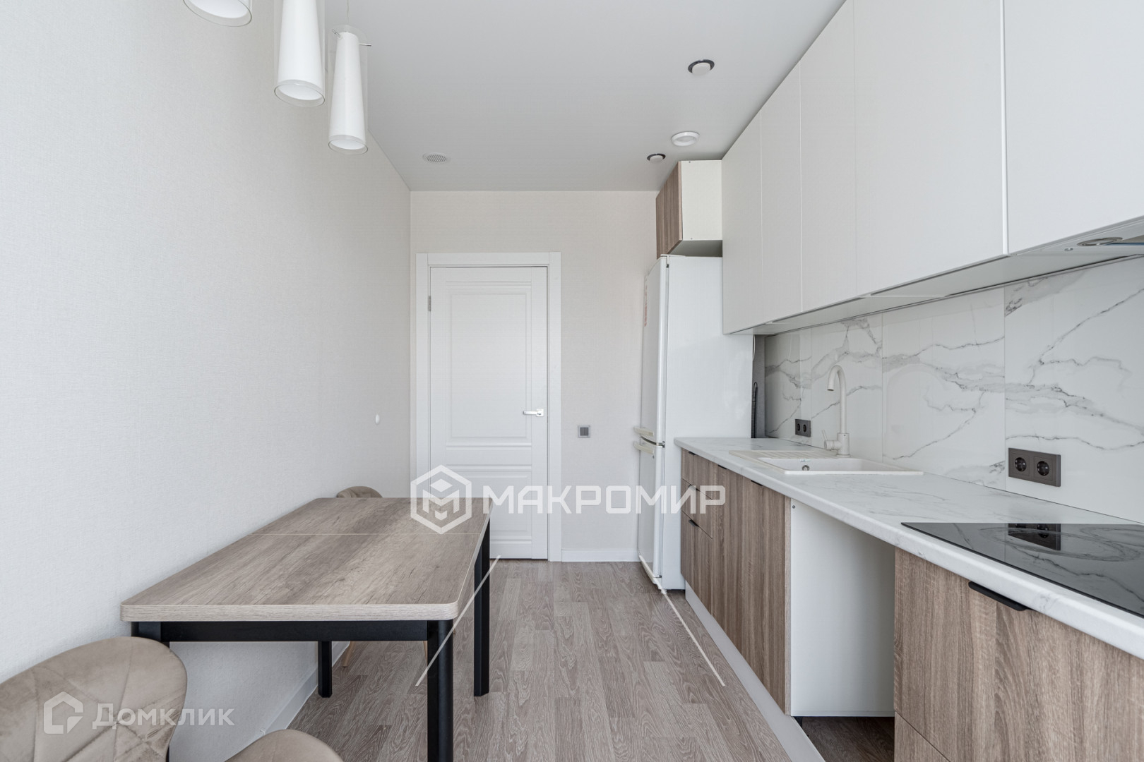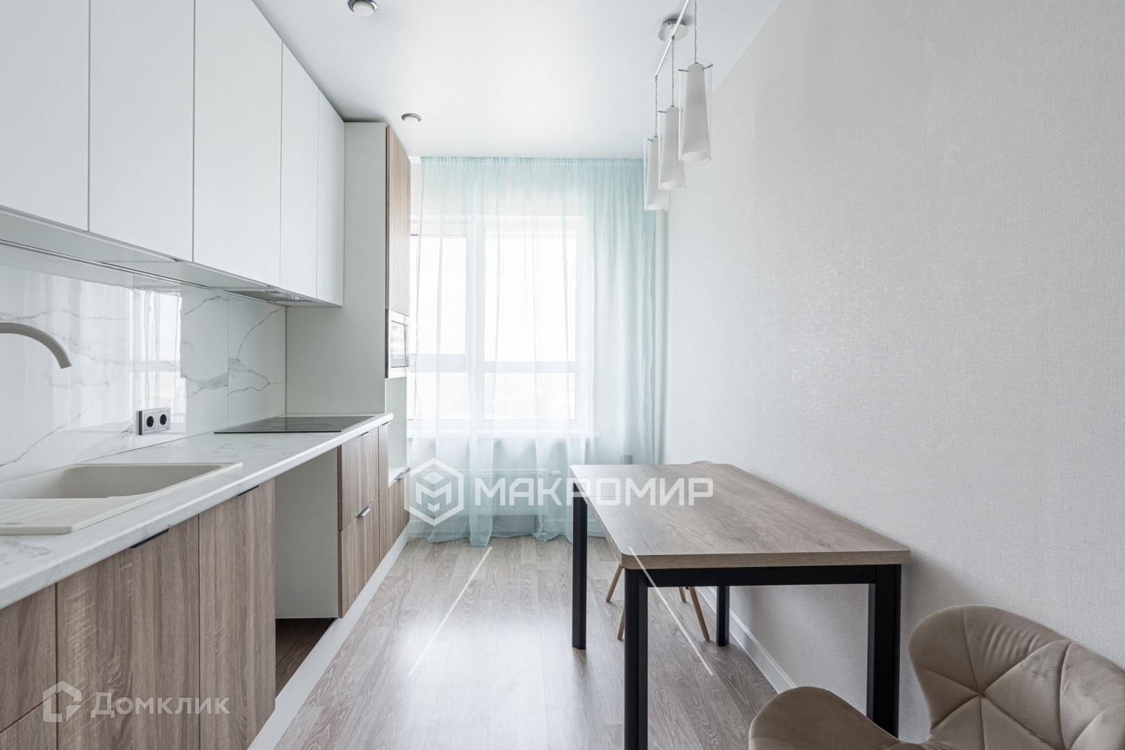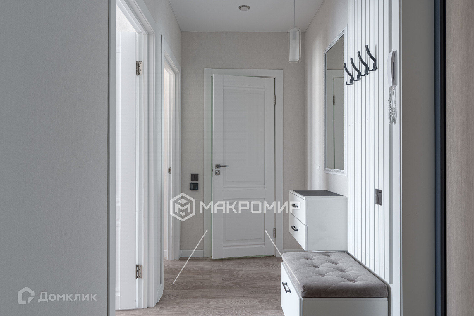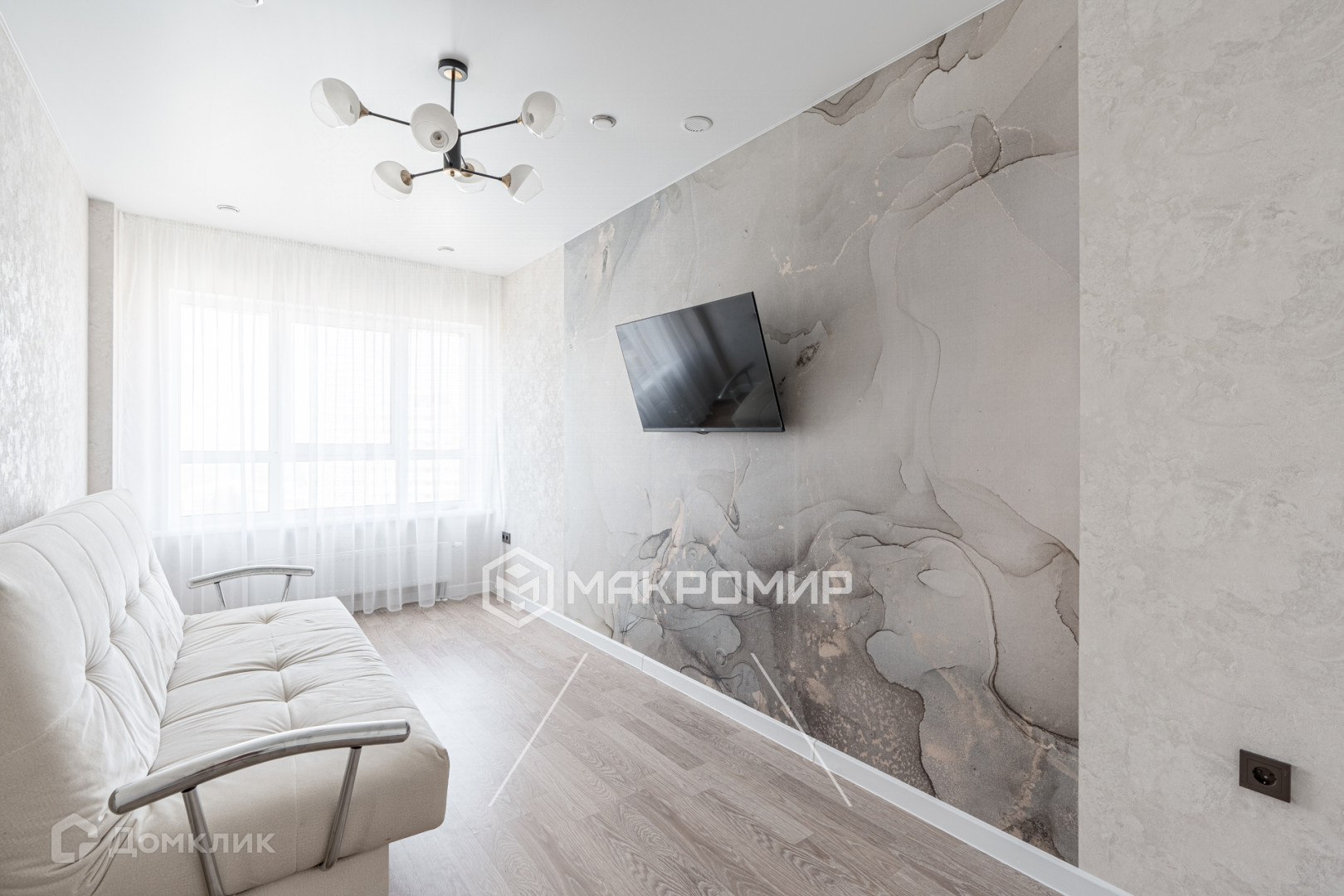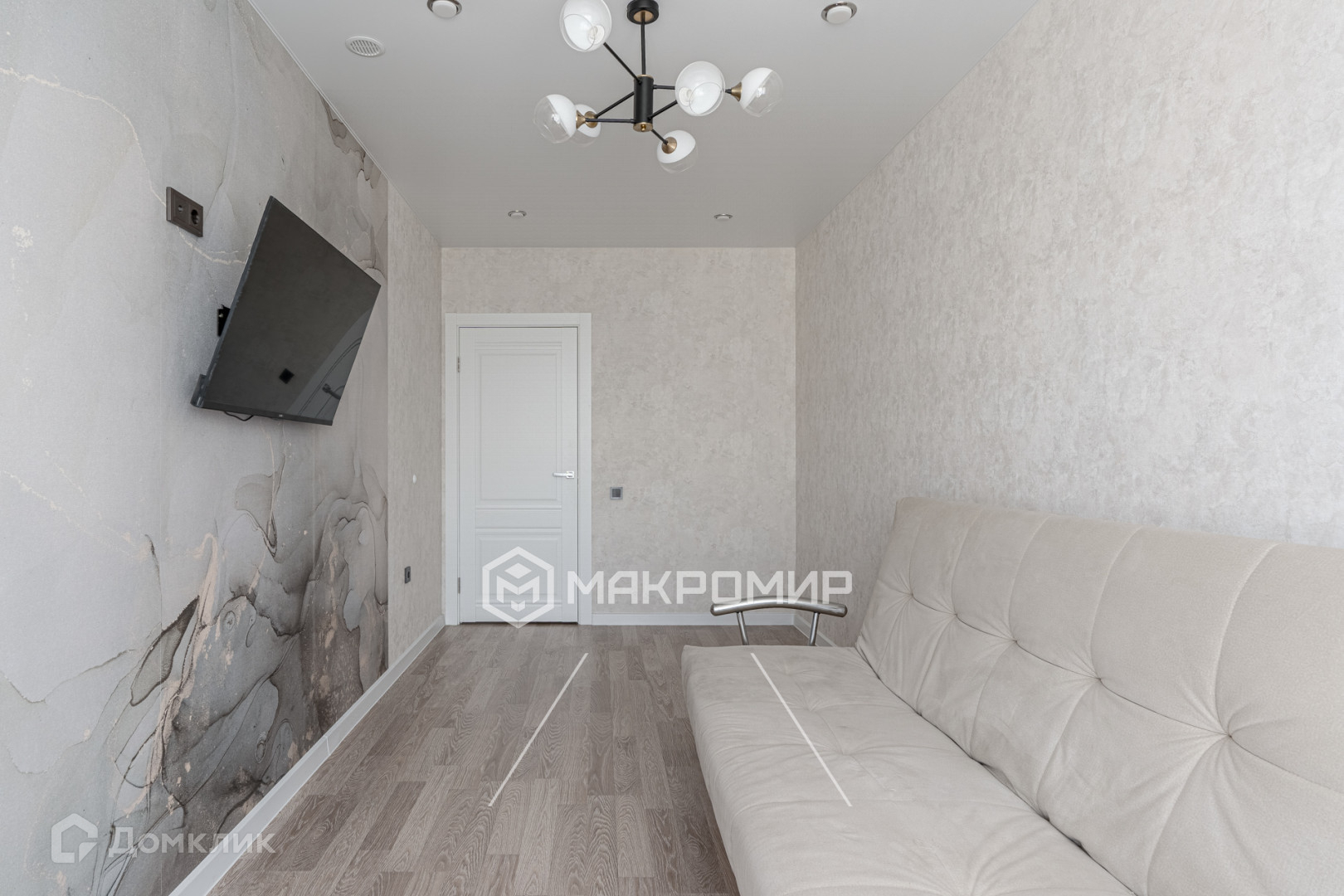 квартира в светлых тонах, на полу ламинат, в с/у керамогранит, натяжные потолки, моющиеся обои