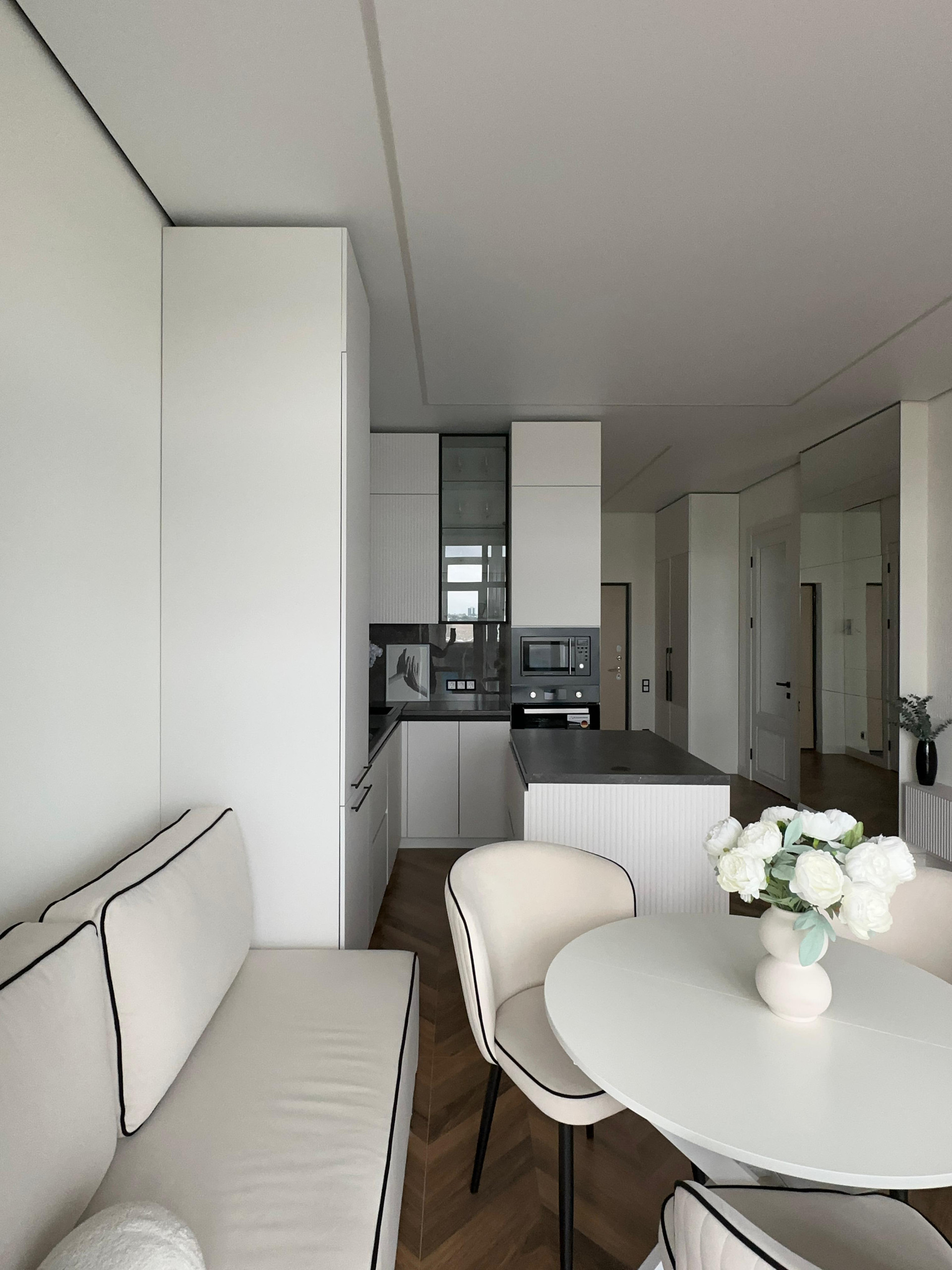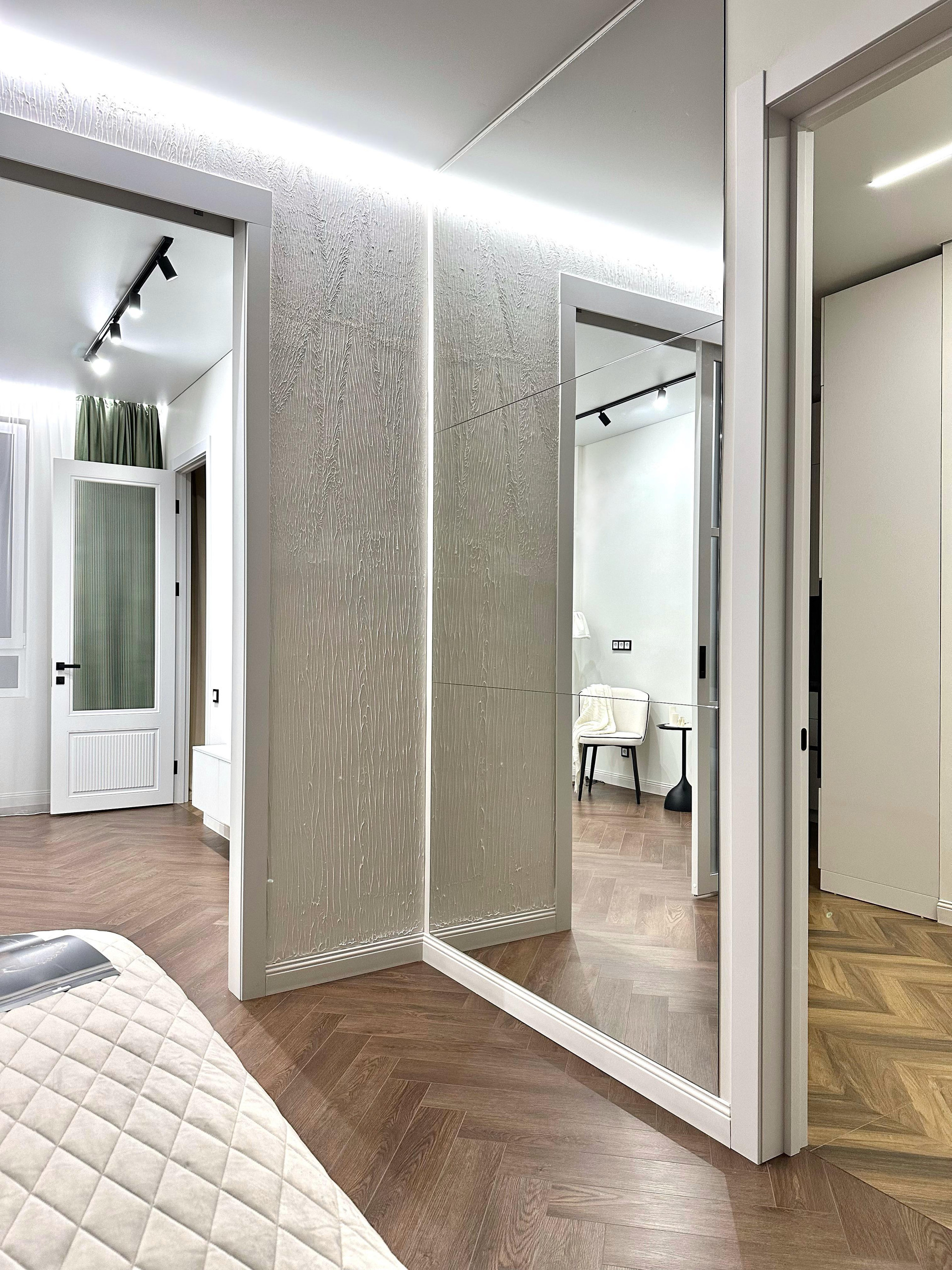 Несколько сценариев освещения , теневой потолок, большие зеркала, шкаф в прихожей.