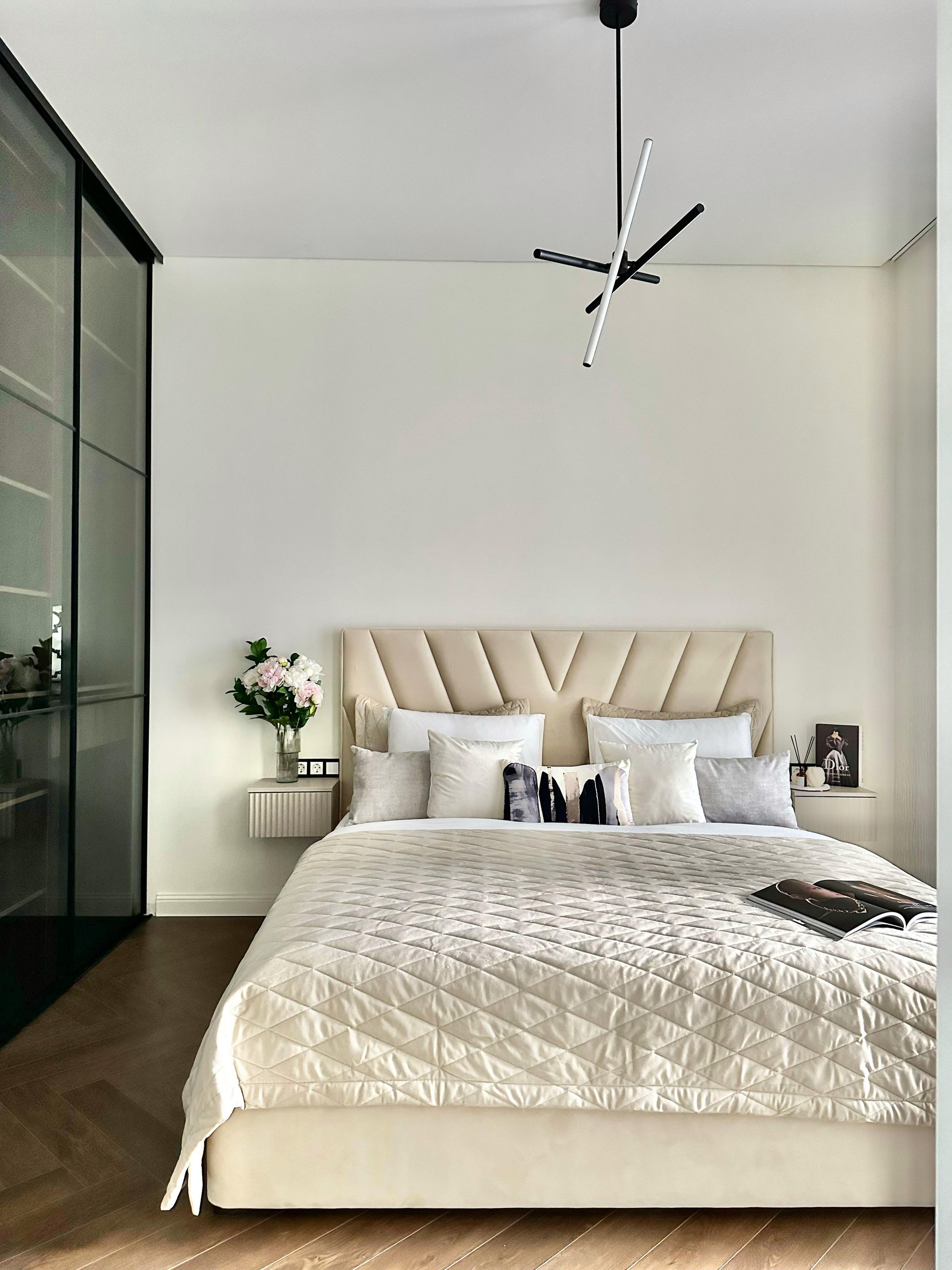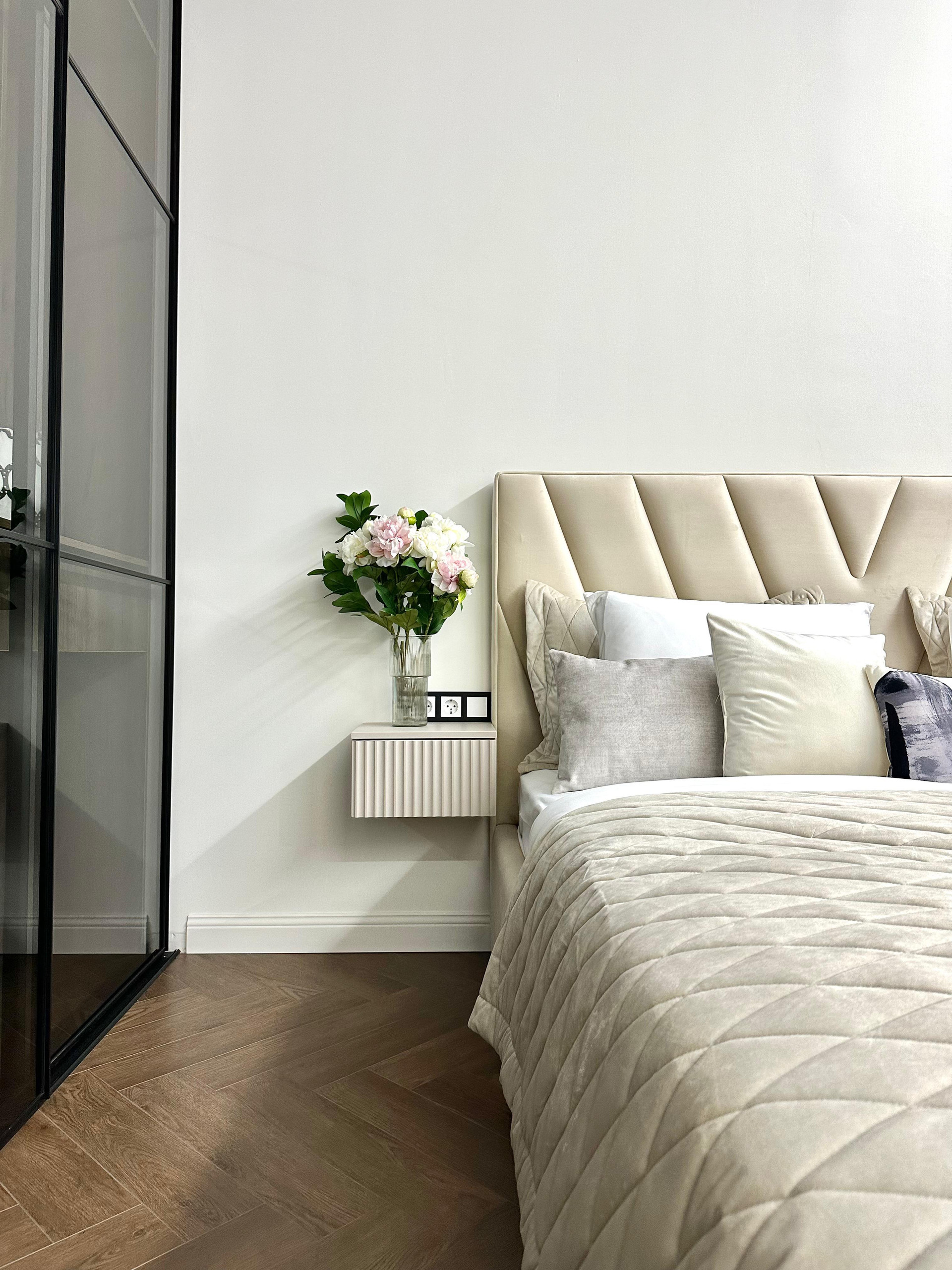 Кровать 180*200 с бельевым ящиком , подъемным механизмом , ортопедическим итальянским матрасом. Выпонена специально на заказ для этой квартиры. Ткань премиальная, износостойкая.