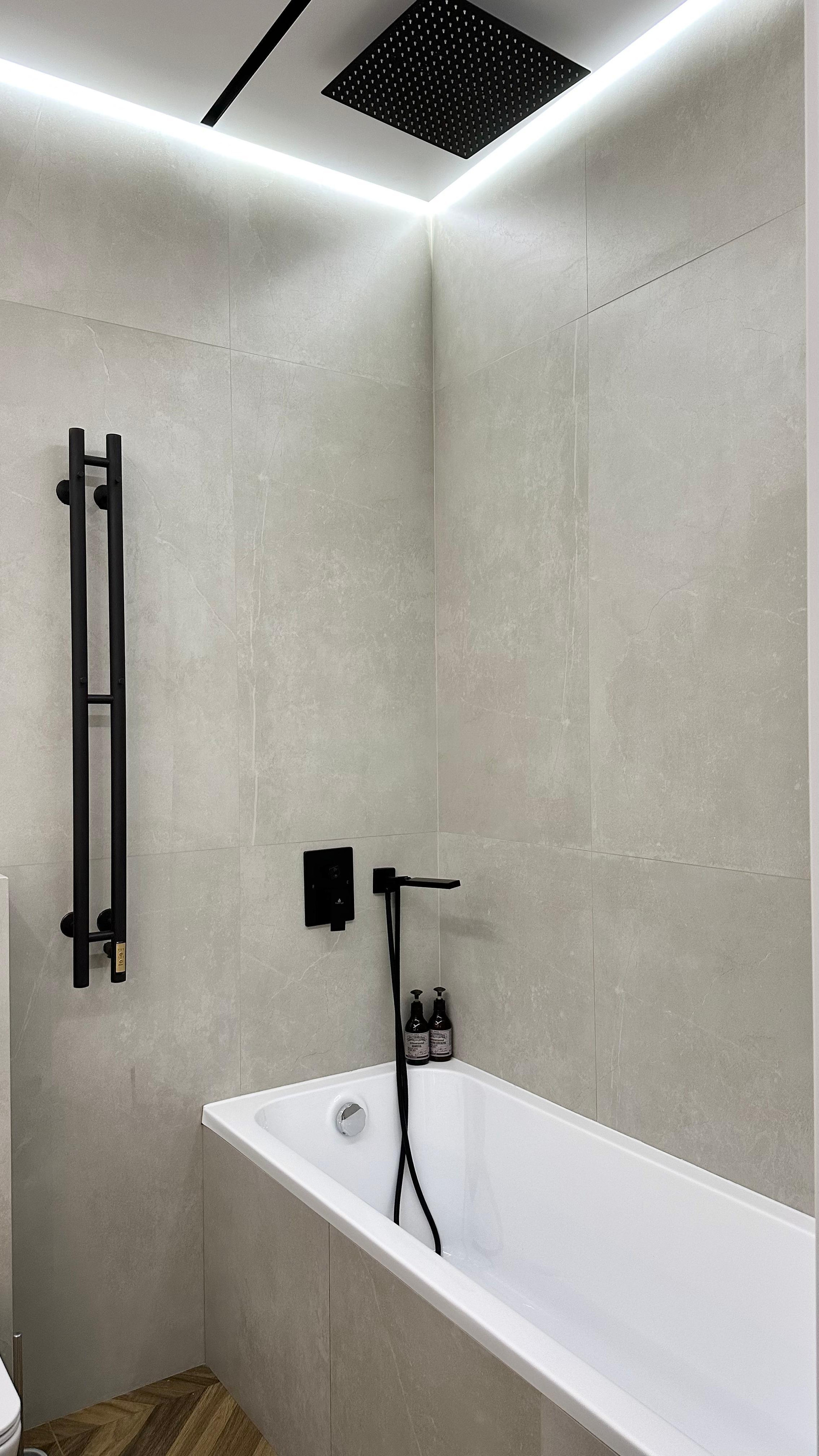 Встроенные смесители , несколько сценариев освещения, есть встроенная ниша под душевую перегородку.
