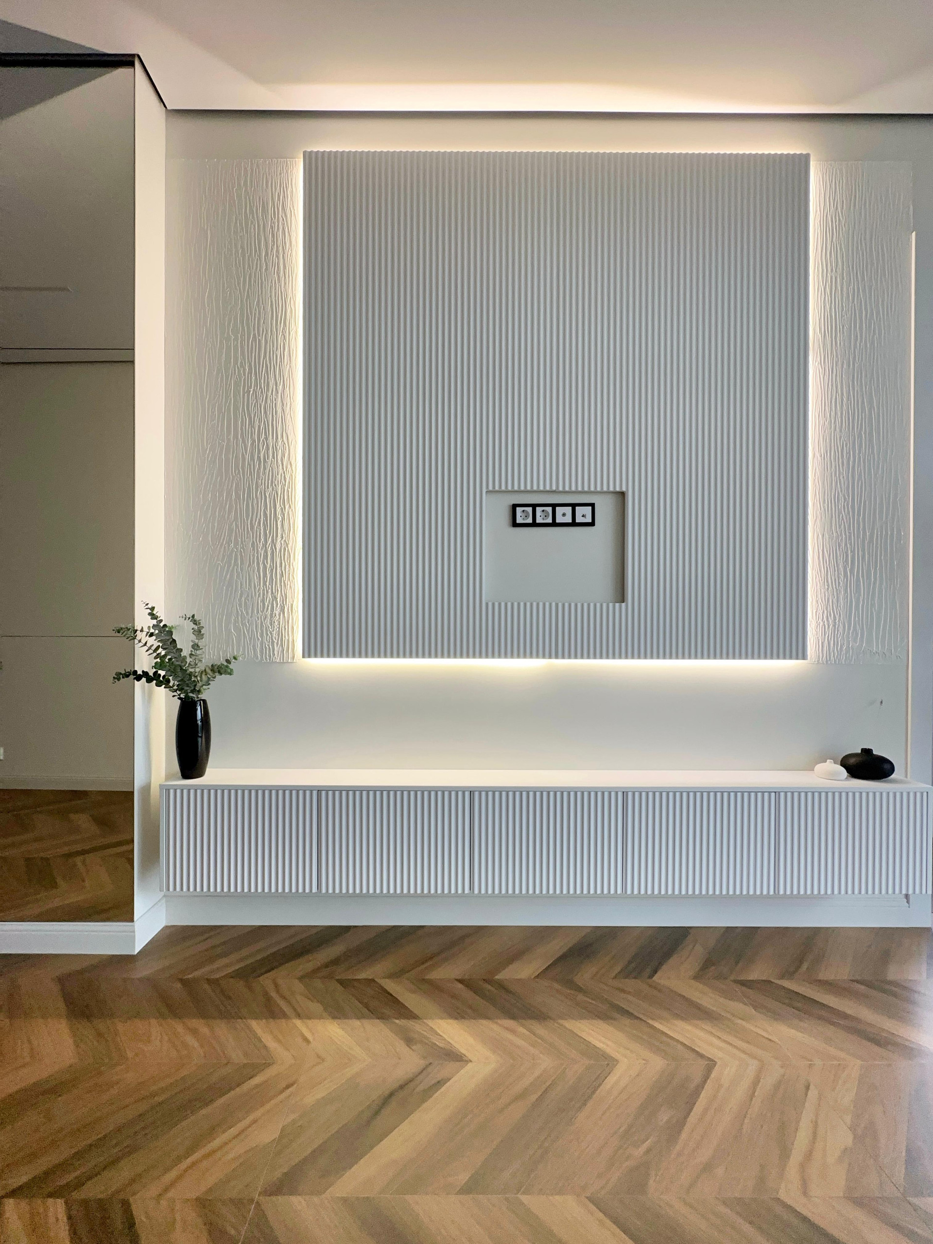 Тумбы под ТВ, дизайнерское решение зона под ТВ с подсветкой.