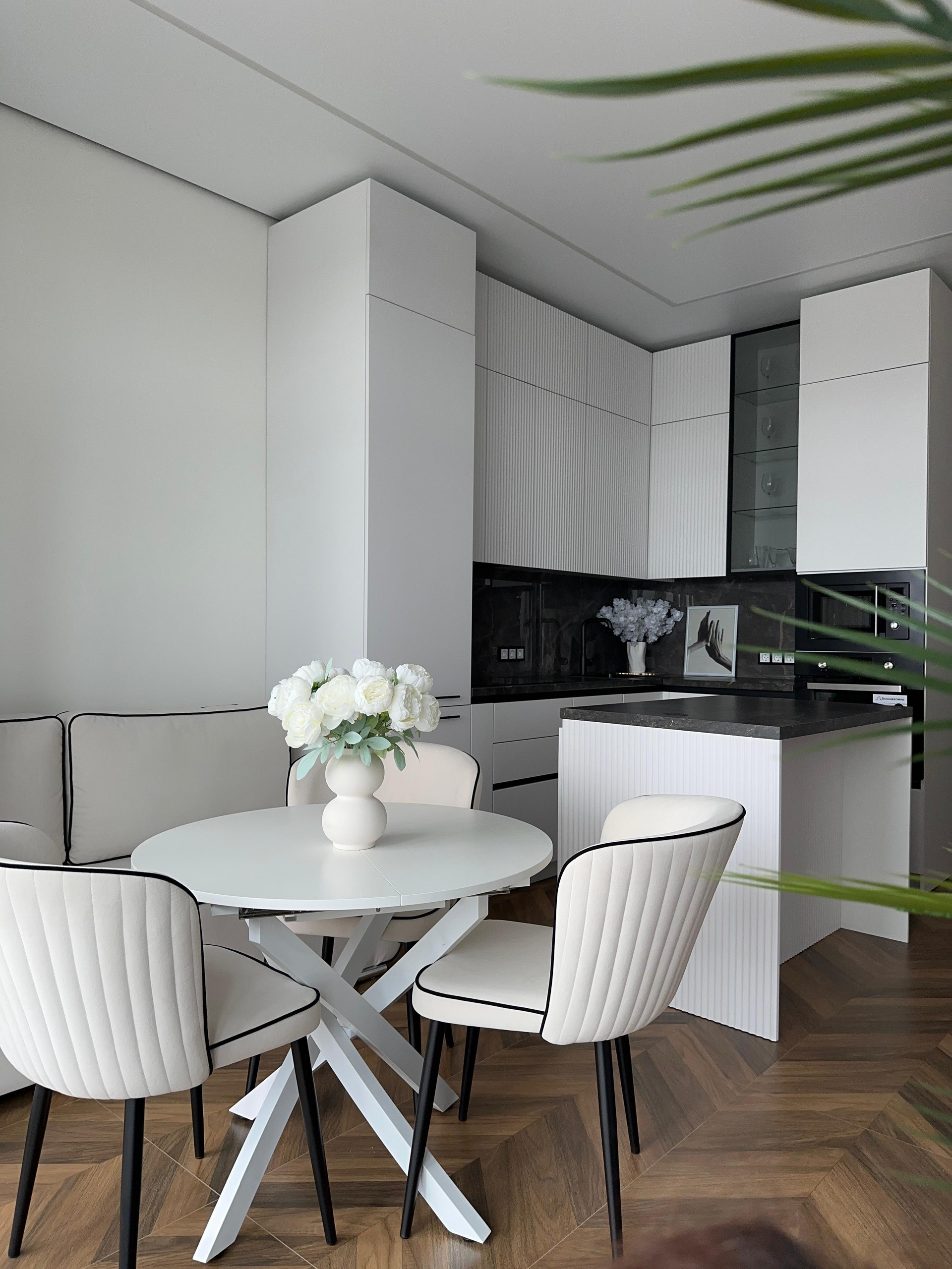 Кухня со встроенной немецкой бытовой техникой (холодильник , посудомоечная машинка, духовой шкаф, микроволновая печь, вытяжка) с кухонным островом для приготовления еды.