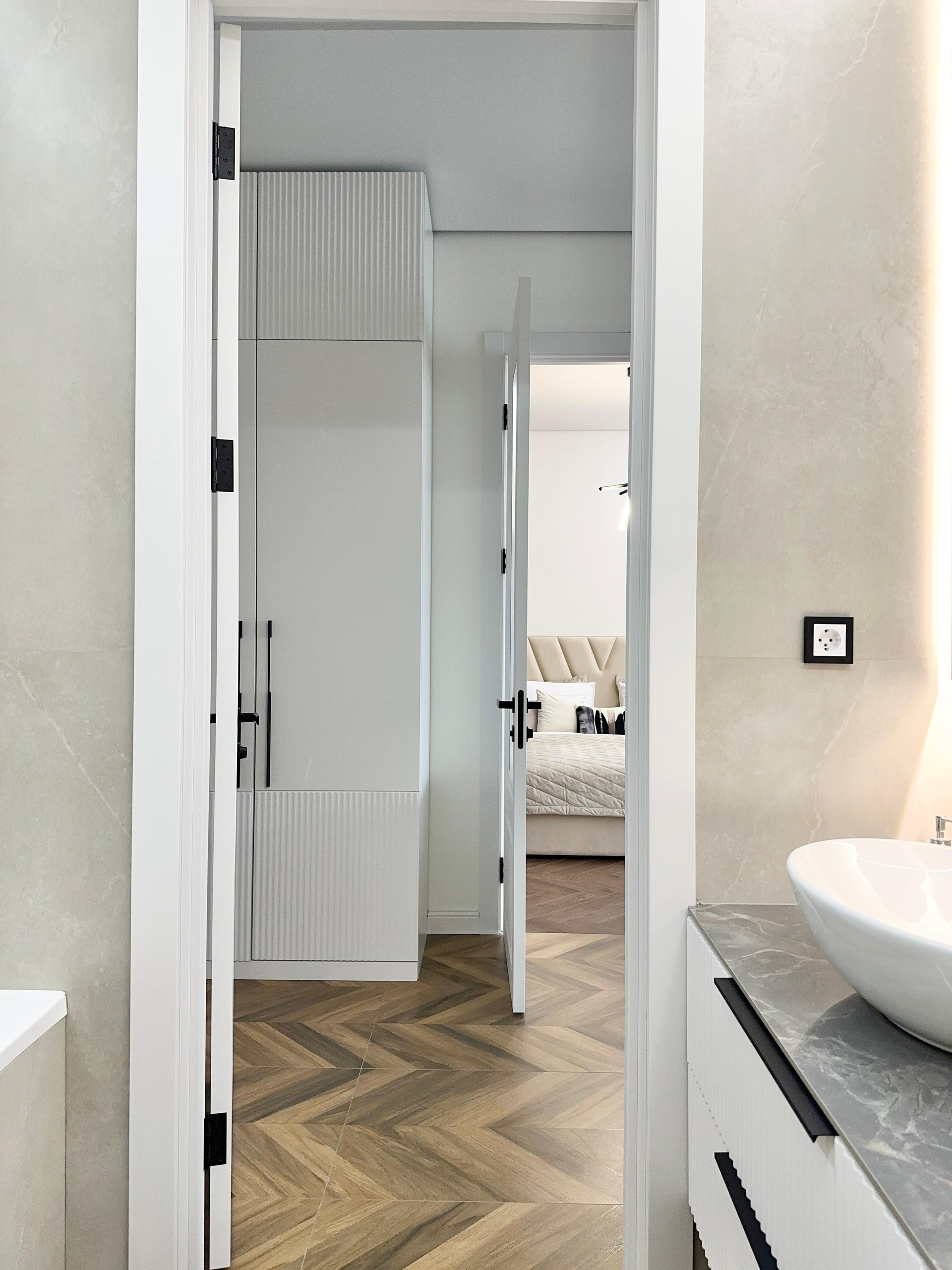 В спальне - вместительный встроенный шкаф-купе со современными стеклянными дверями - перегородками.