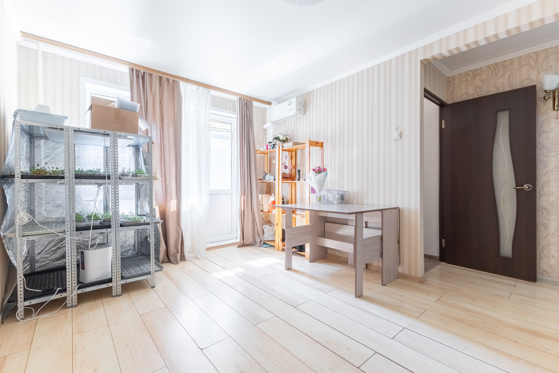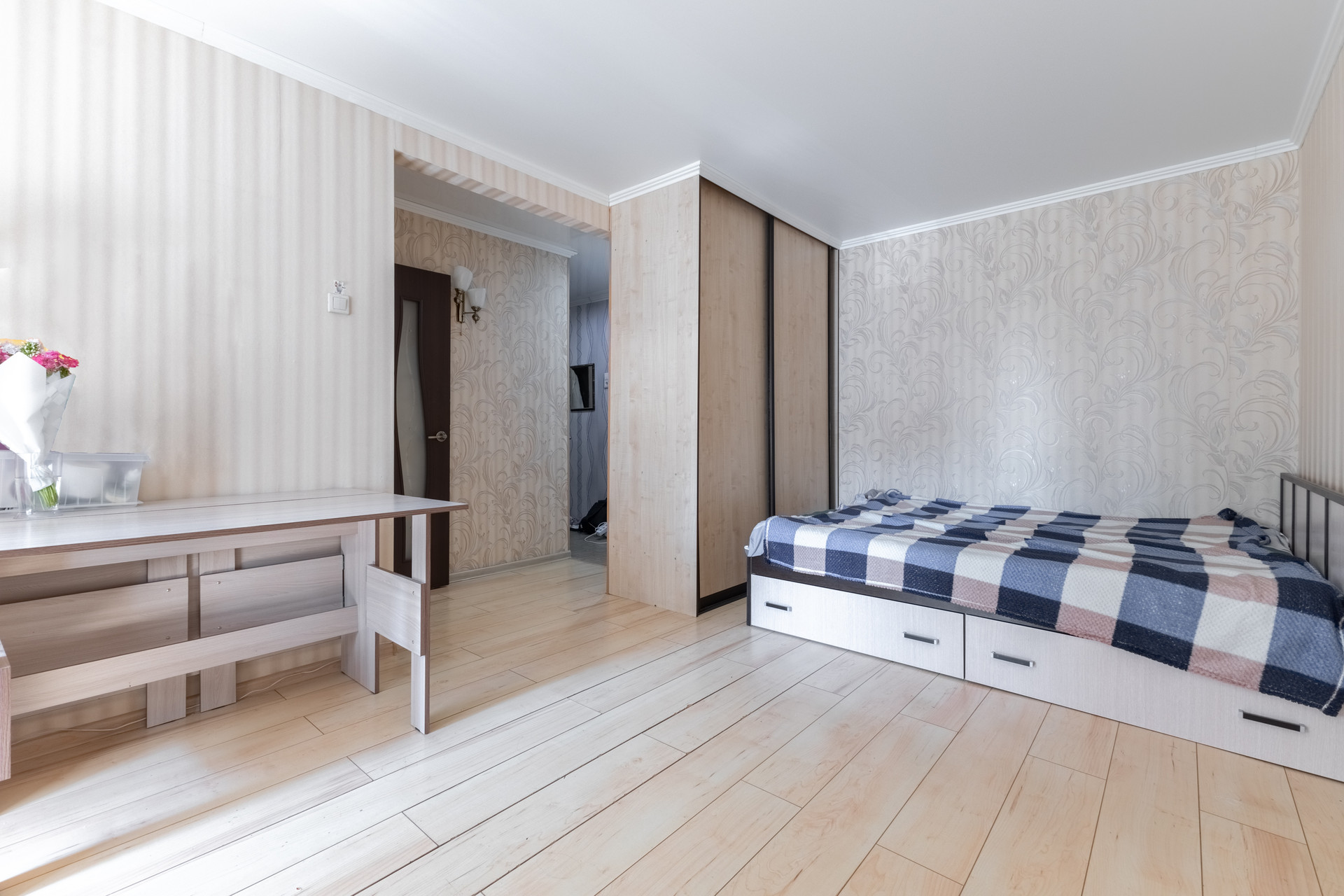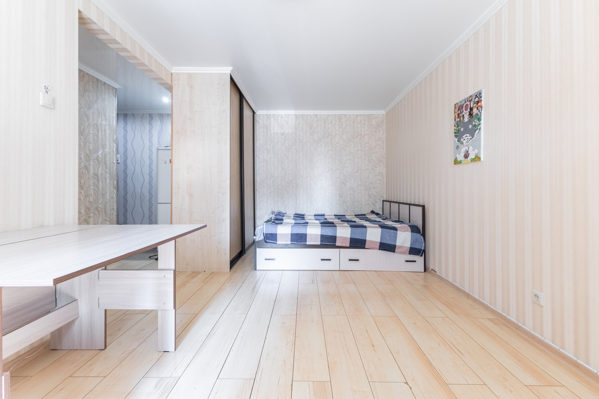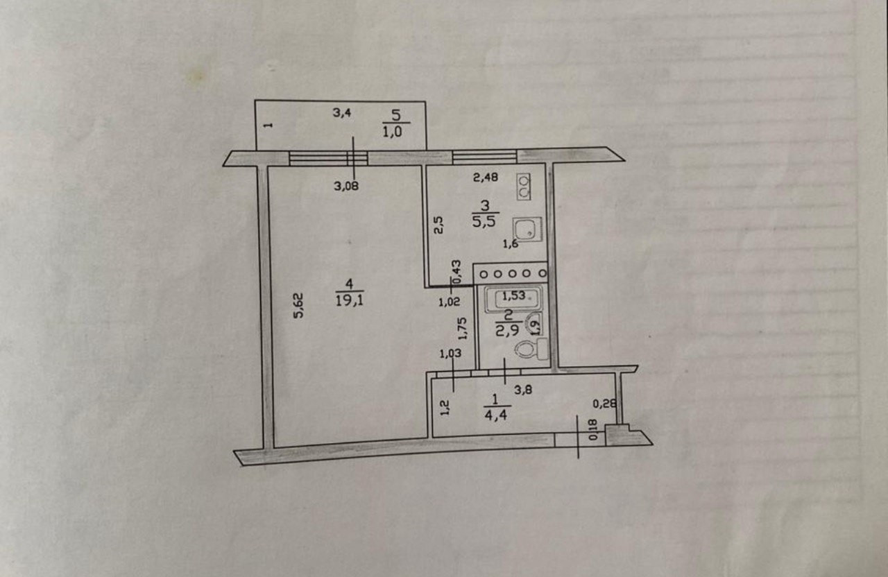 Общая площадь - 32 кв.м., из них: кухня – 6 кв.м., жилaя комнатa - 19 кв.м. санузел совмещен, балкон застеклен c выходoм из комнаты.