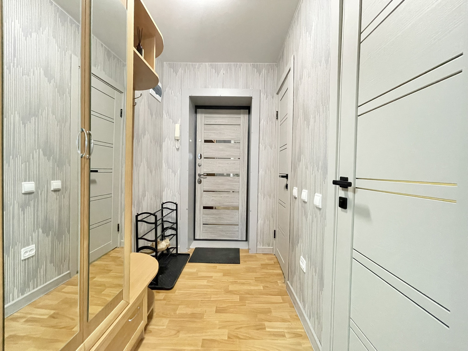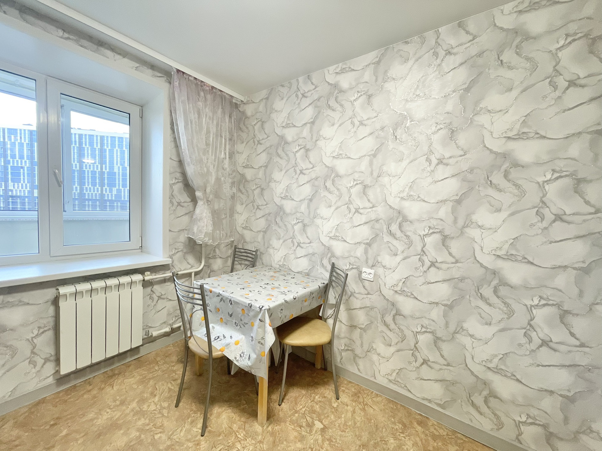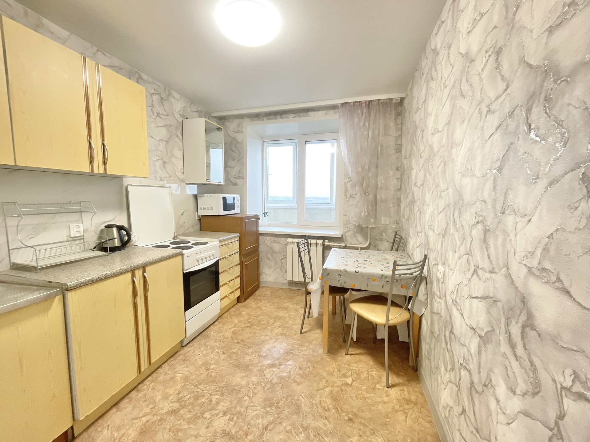 С хорошим ремонтом, мебелью и техникой. Холодильник, стиральная машина, микроволновая печь, плита, духовой шкаф. Из мебели диван, двуспальная кровать, шкафы для хранения. Все останется в квартире.