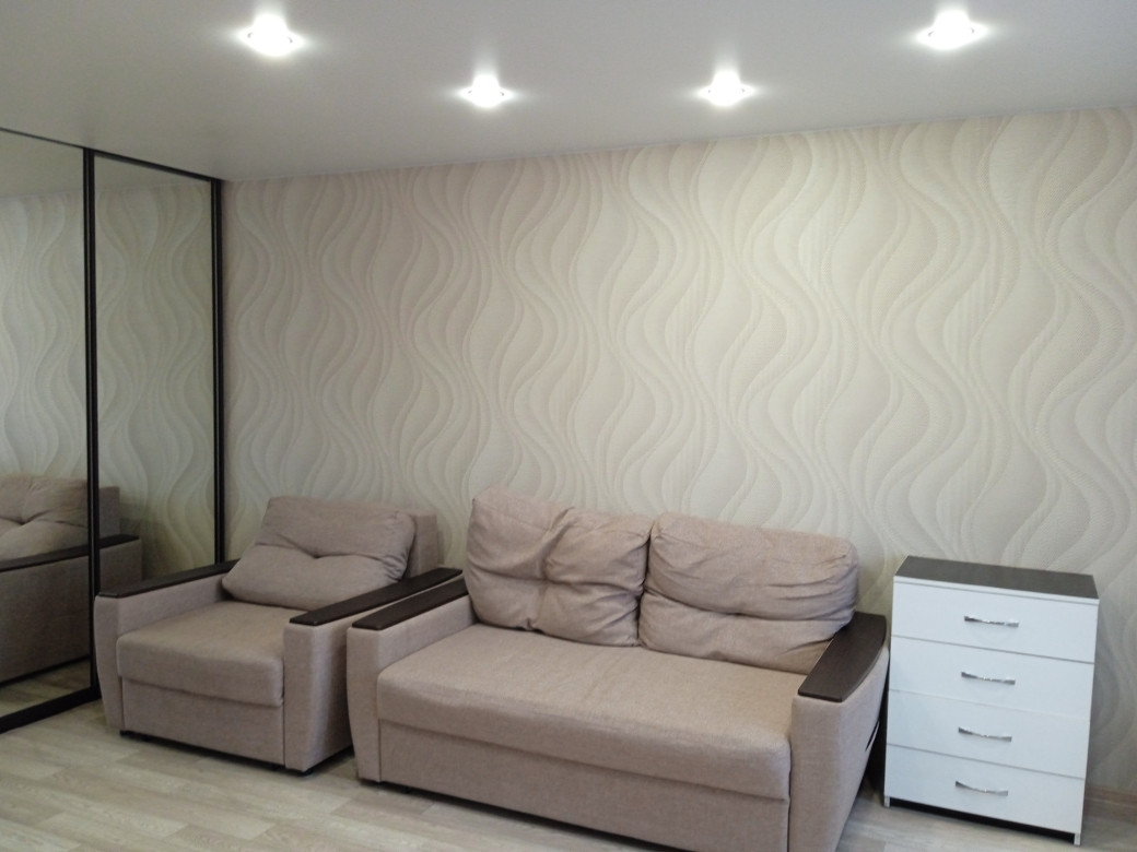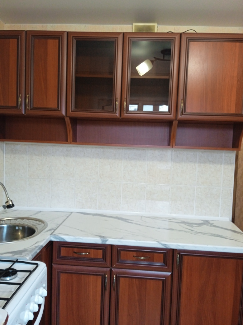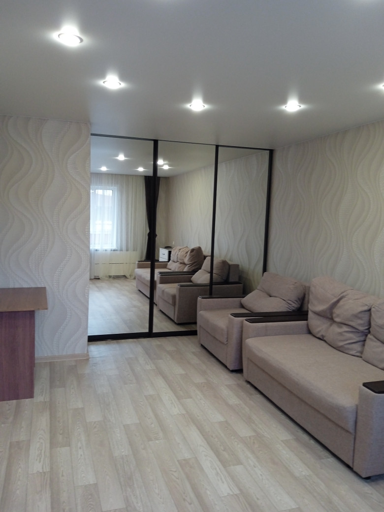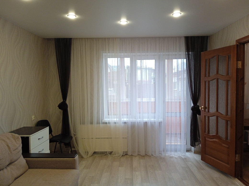 В квартире выполнен косметический ремонт: натяжные потолки, обои в светлых тонах, на полу ламинат, лоджия застеклена и обшита деревом.