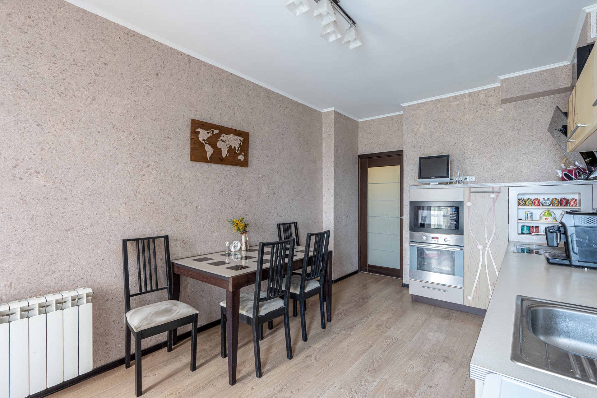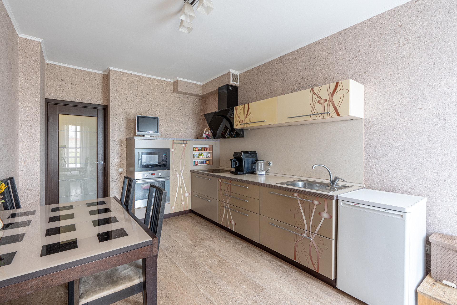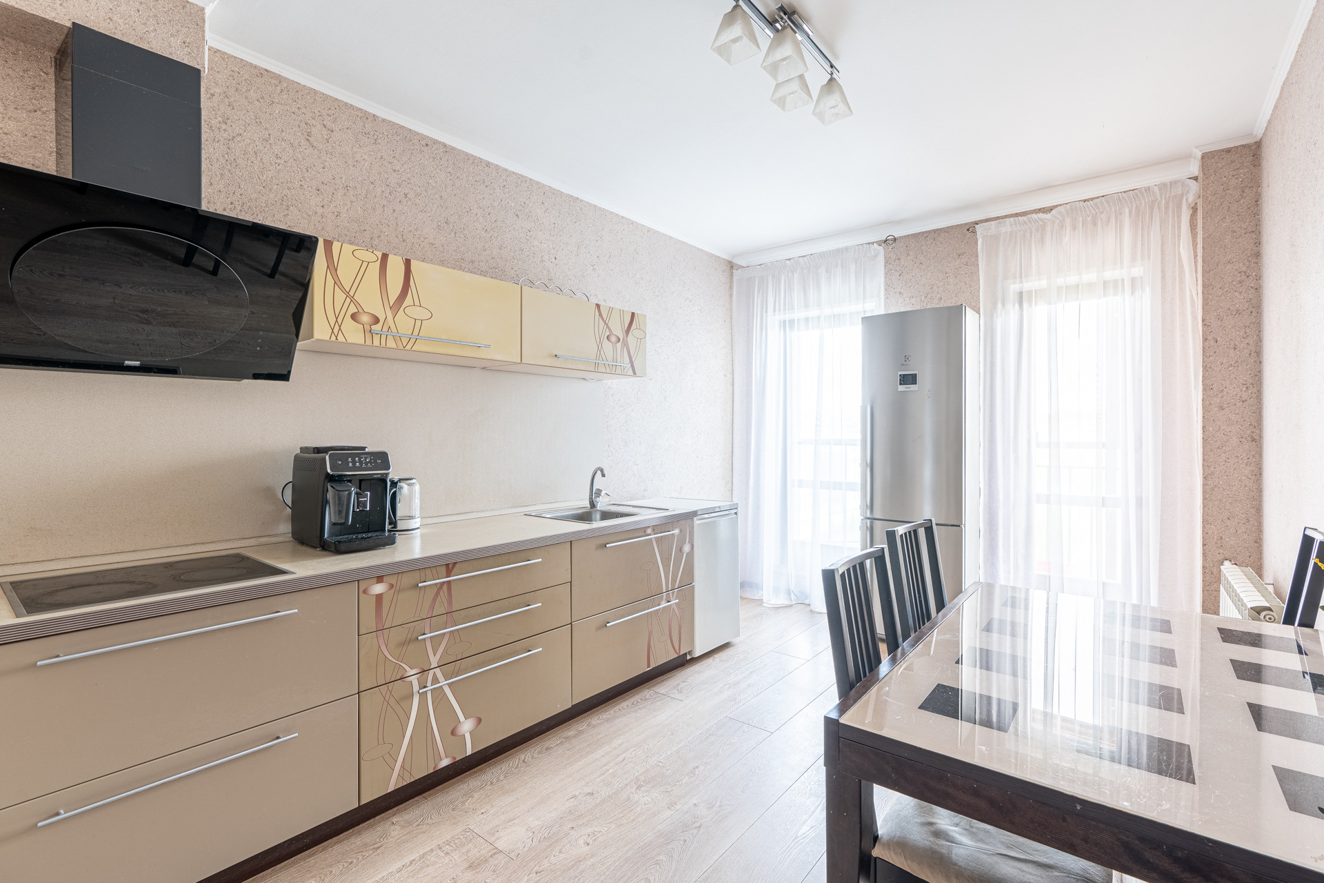 Большая кухня (15,5 кв.м) оборудована качественным гарнитуром. Это отличное место для семейных ужинов и дружеских посиделок.