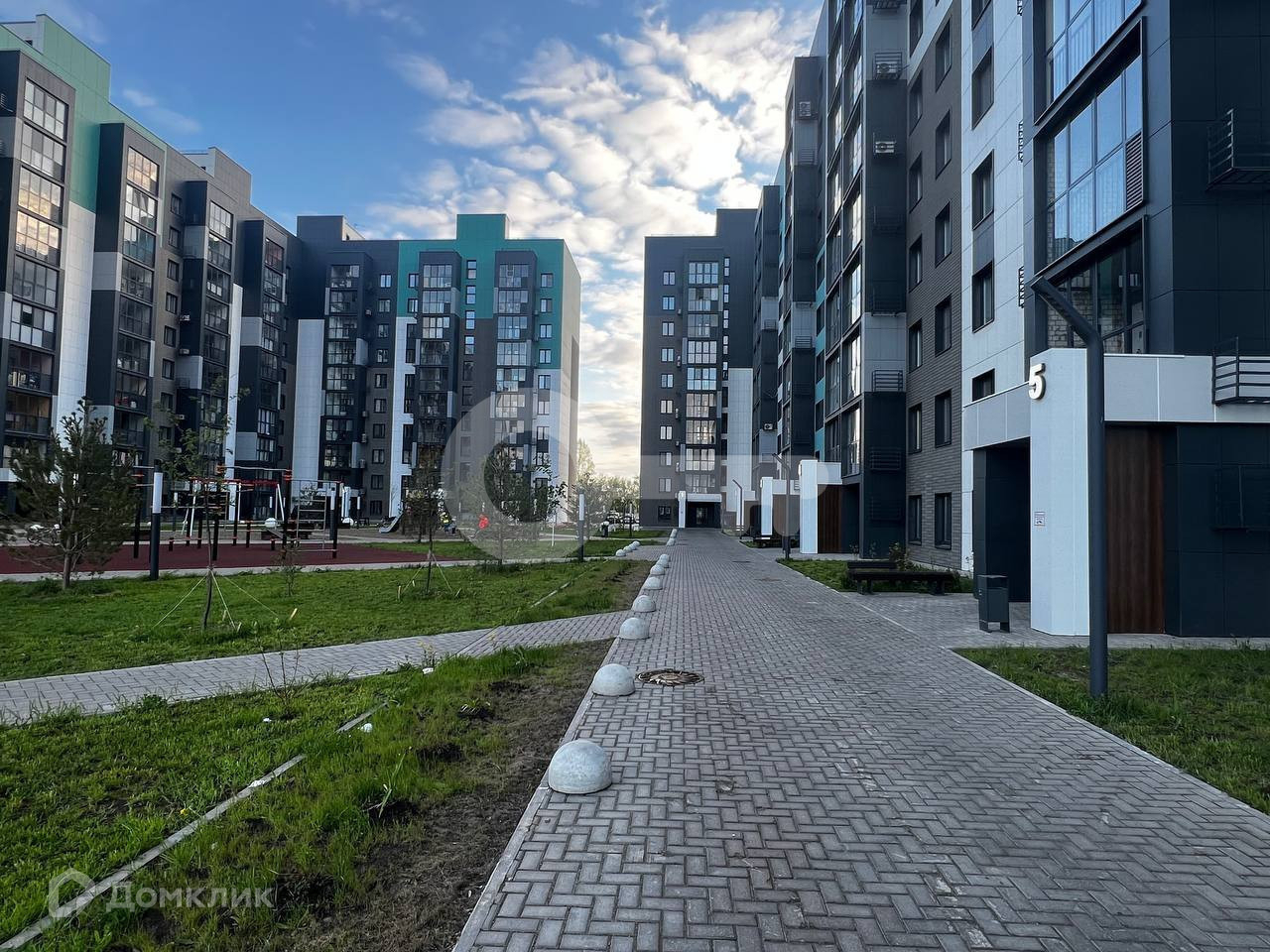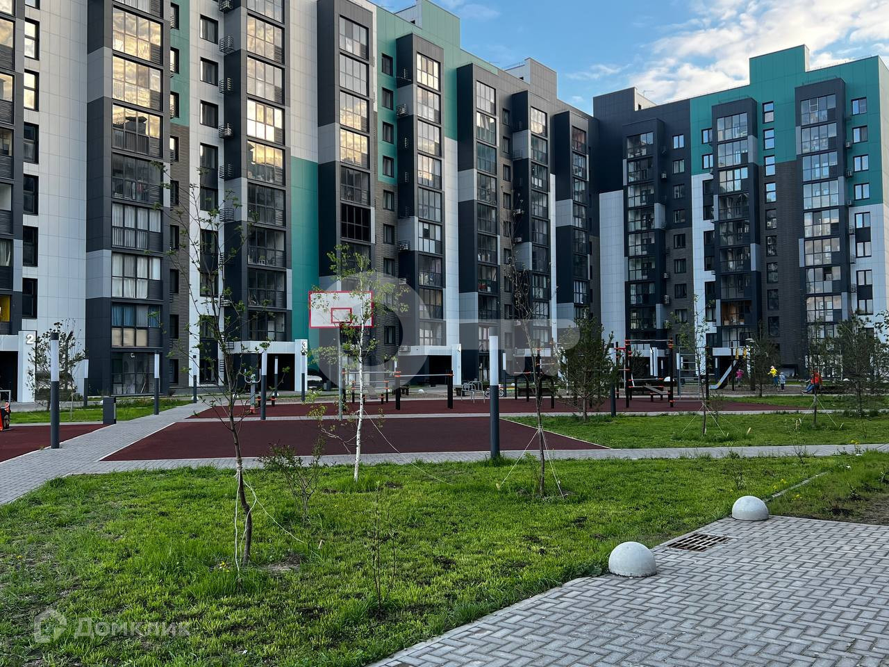 Закрытый двор с детскими площадками и озеленением, местами для занятий спортом, беседками и зонами отдыха, большим паркингом.