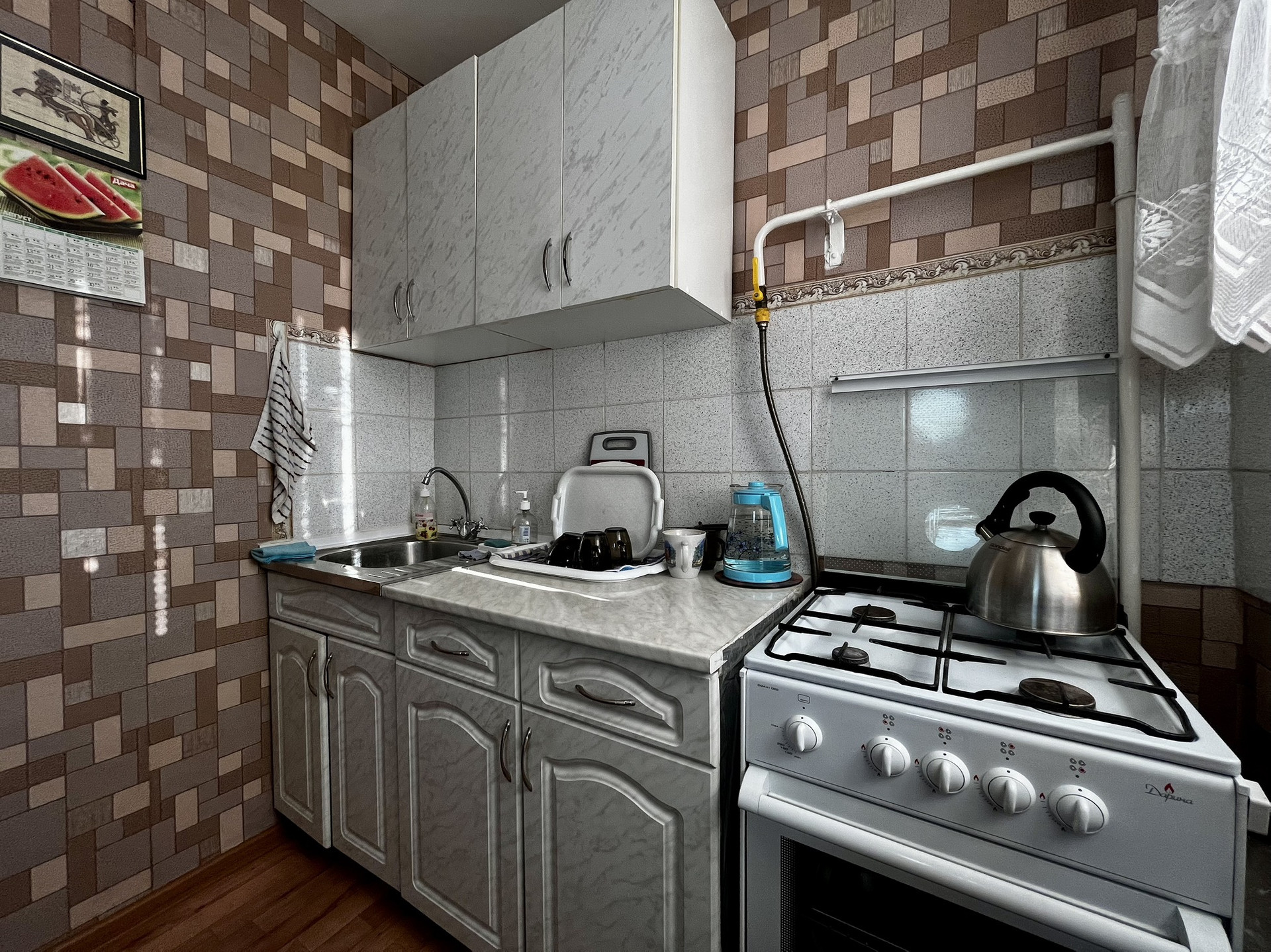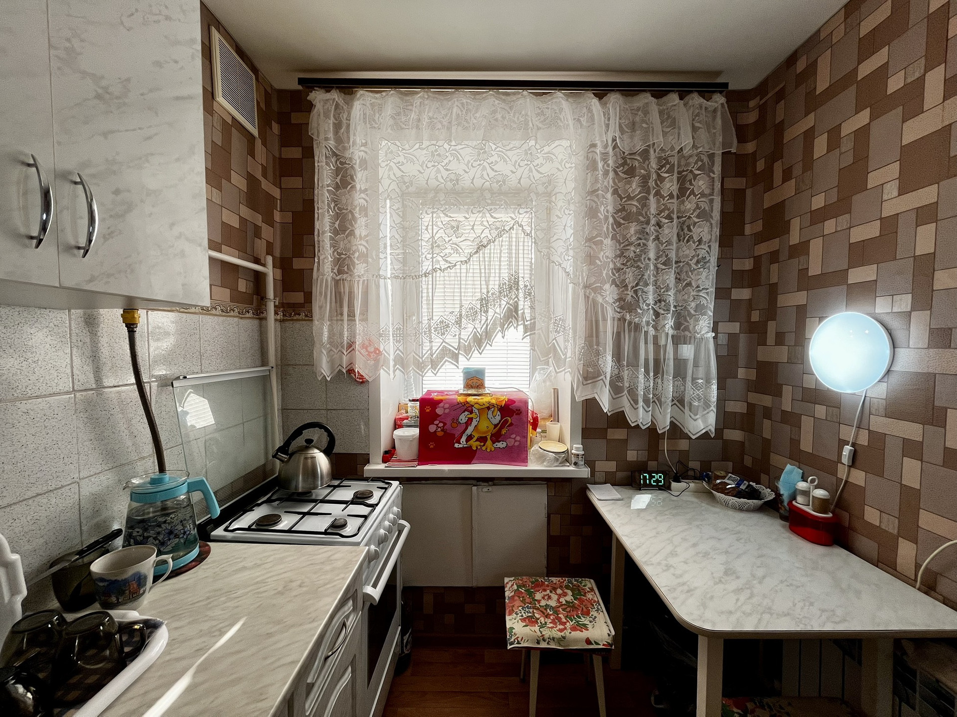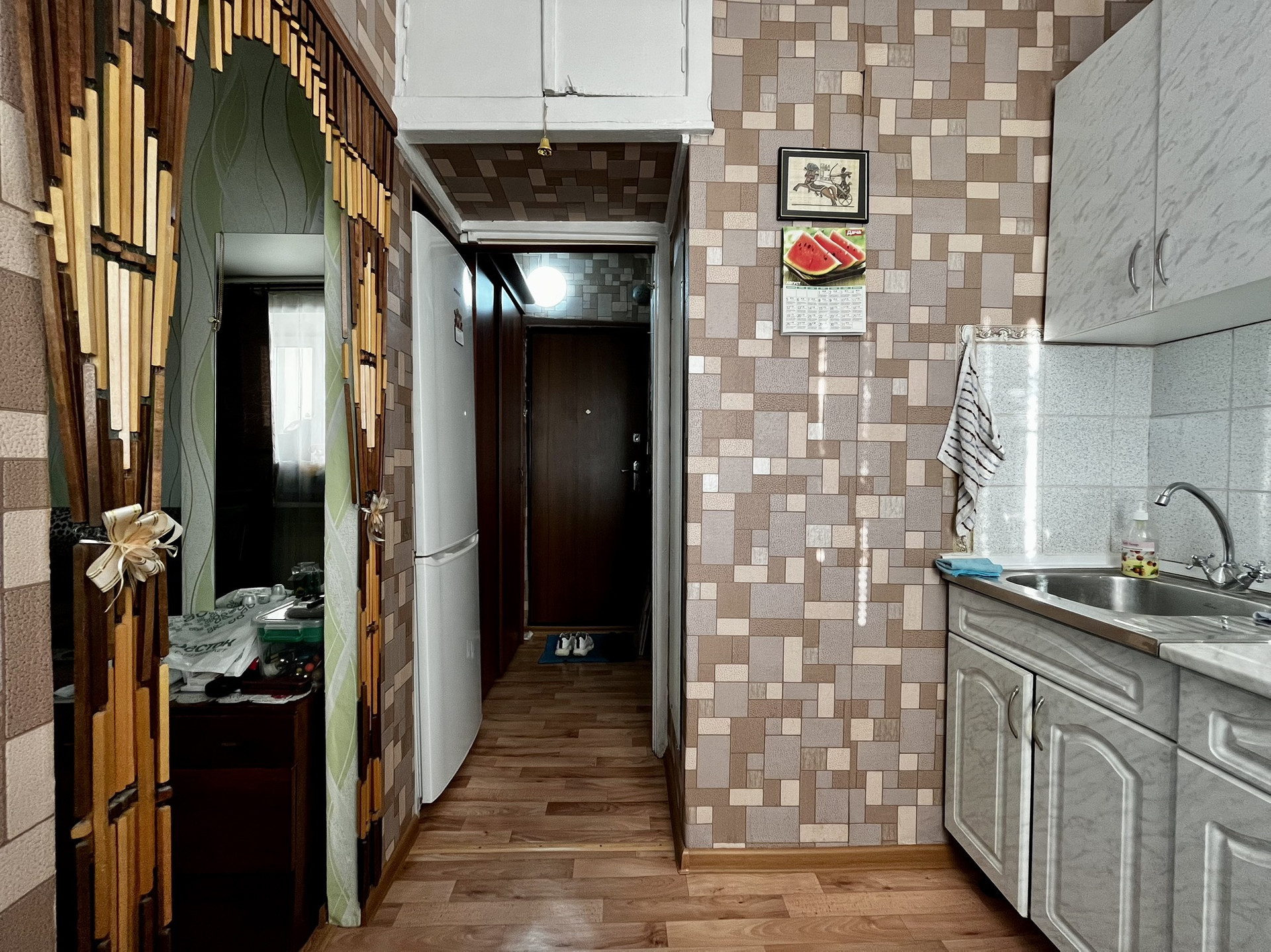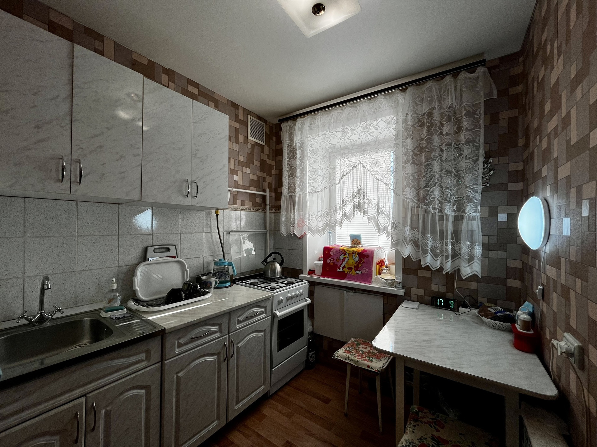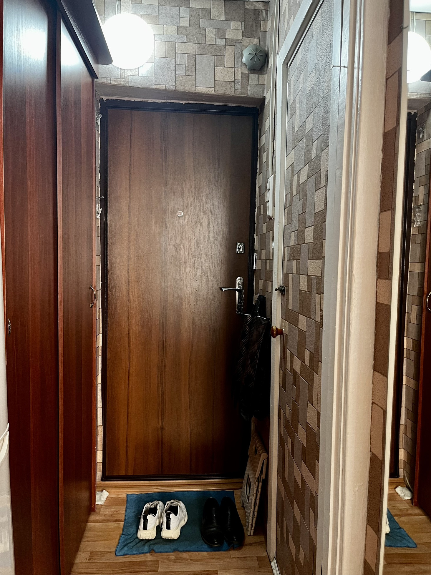 Квартира общей площадью 23кв. м, жилая площадь 14кв. м, кухня — 5кв. м. Расположена на 9 этаже 9-этажного кирпичного дома, построенного в 1977 году.