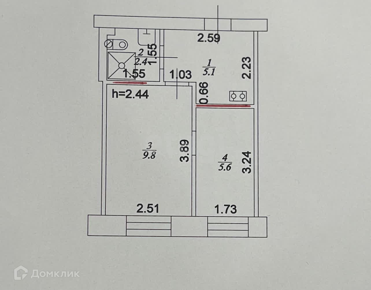 Общая площадь квартиры - 24 кв.м. Две жилые комнаты: 10 кв.м. и 6 кв.м., кухонная зона с коридором 5 кв.м., сан/узел 2.4 кв.м.