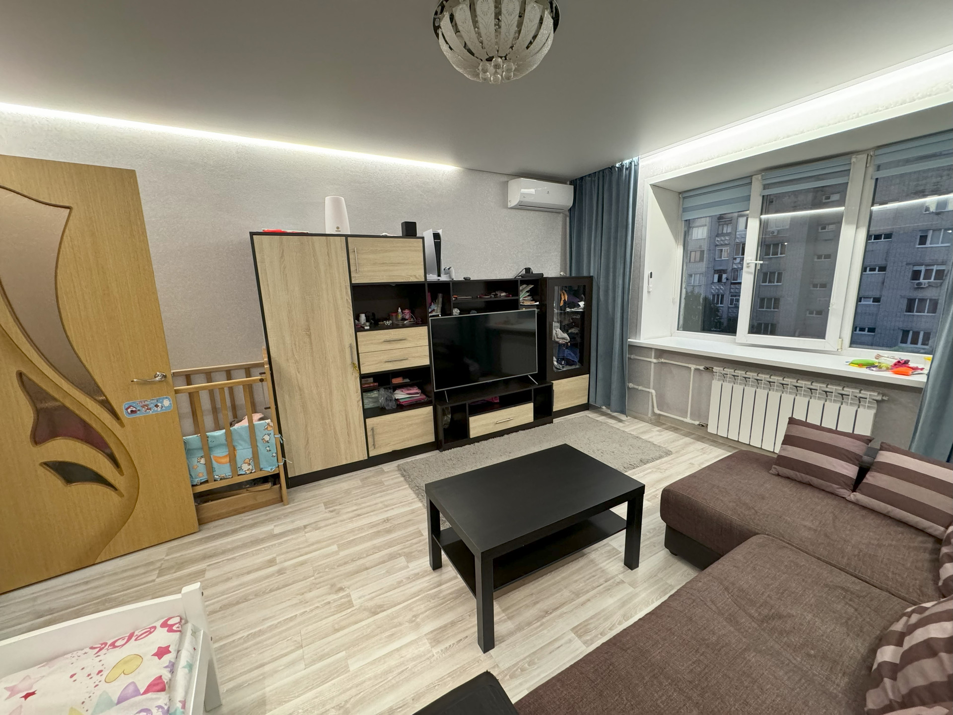 Из окон открывается вид на тихий и зелёный двор, где расположена детская площадка. Рядом с домом находятся все необходимые объекты инфраструктуры: школа, детский сад, торговый центр и парк, что делает эту локацию особенно привлекательной для жизни.