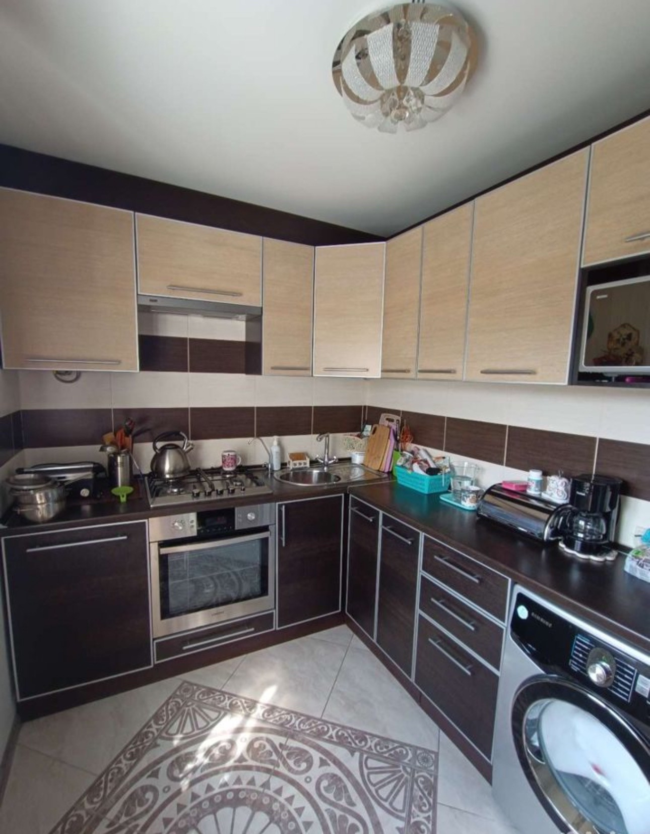 На полу кухни выложена плитка-мозаика. Встроенный духовой шкаф и варочная панель. В кухонном гарнитуре есть ниша для стиральной машины и микроволновой печи. Есть вытяжка. Гарнитур вместительный. По периметру фасада металлические молдинги.