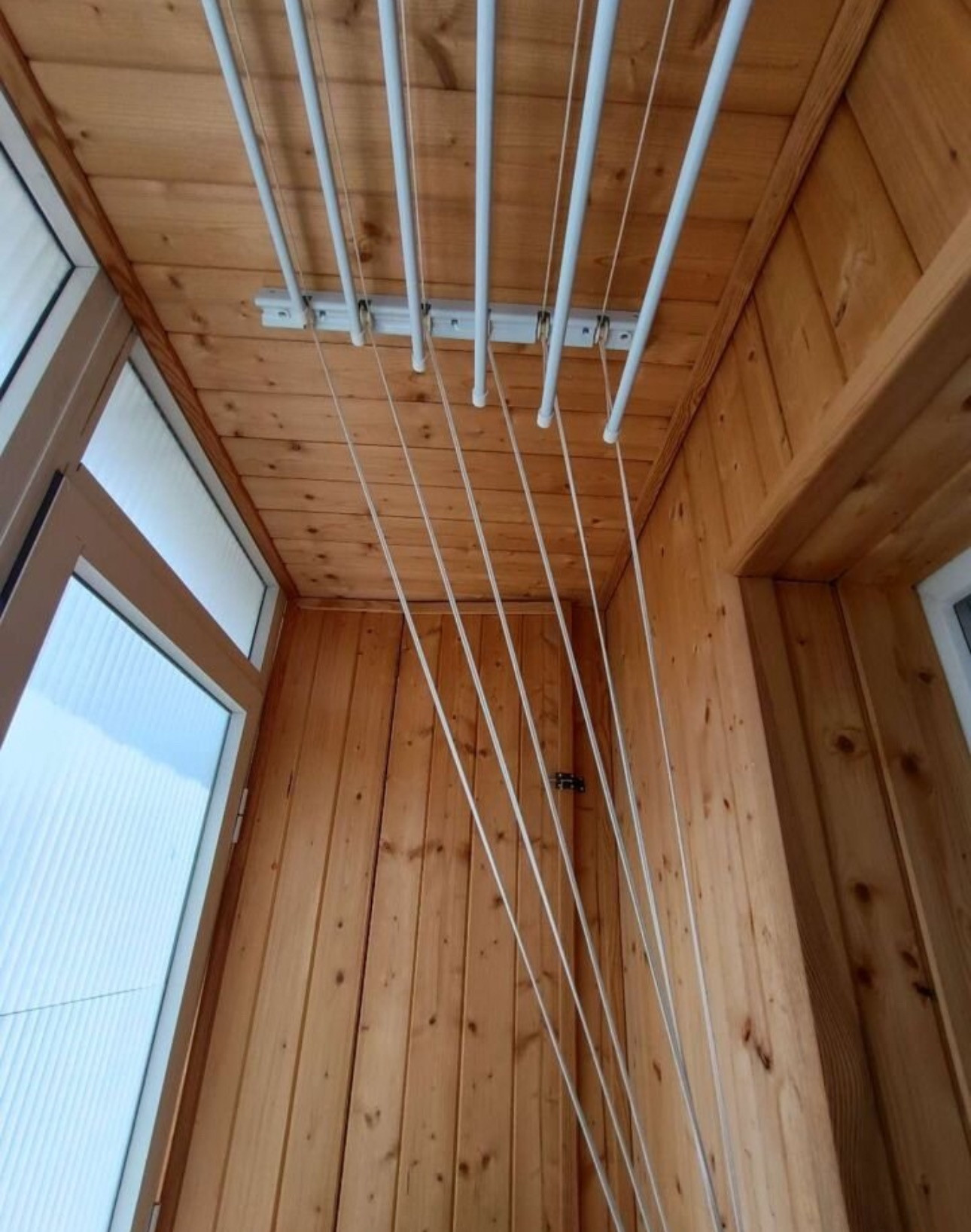 Балкон обшит деревом. С одной стороны большой вместительный шкаф, с другой ниша-тумба. Удобно для хранения вещей.