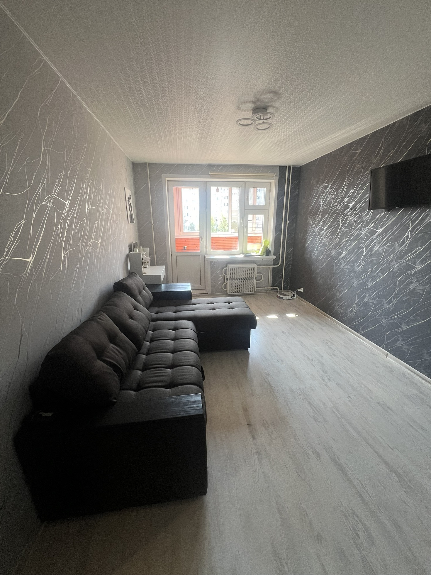 Новый ремонт: санузел , обои , новая сантехника, новая электропроводка, стены выровнены, натяжные потолки, выровнен пол, пластиковые окна, лоджия застеклена. Остается: кухонный гарнитур, шкаф-купе,  стиральная машина, остальная мебель по договоренности.