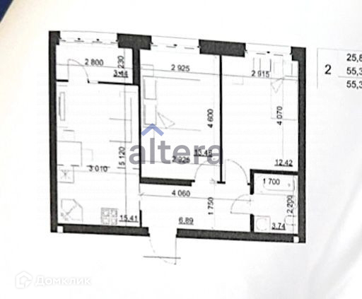 — общая площадь 55,4  кв.м, жилая 25,88 кв.м., кухня – 15,41 кв.м., санузел 3,74кв.м,