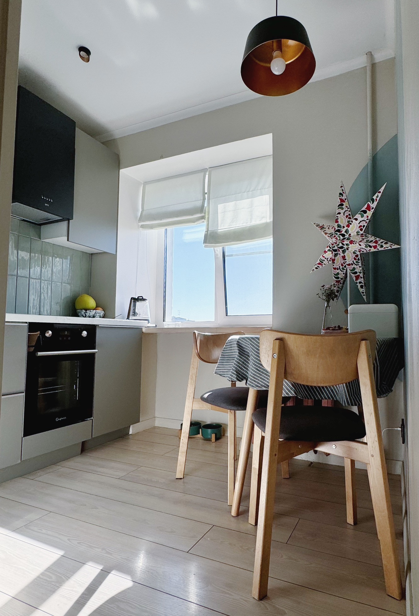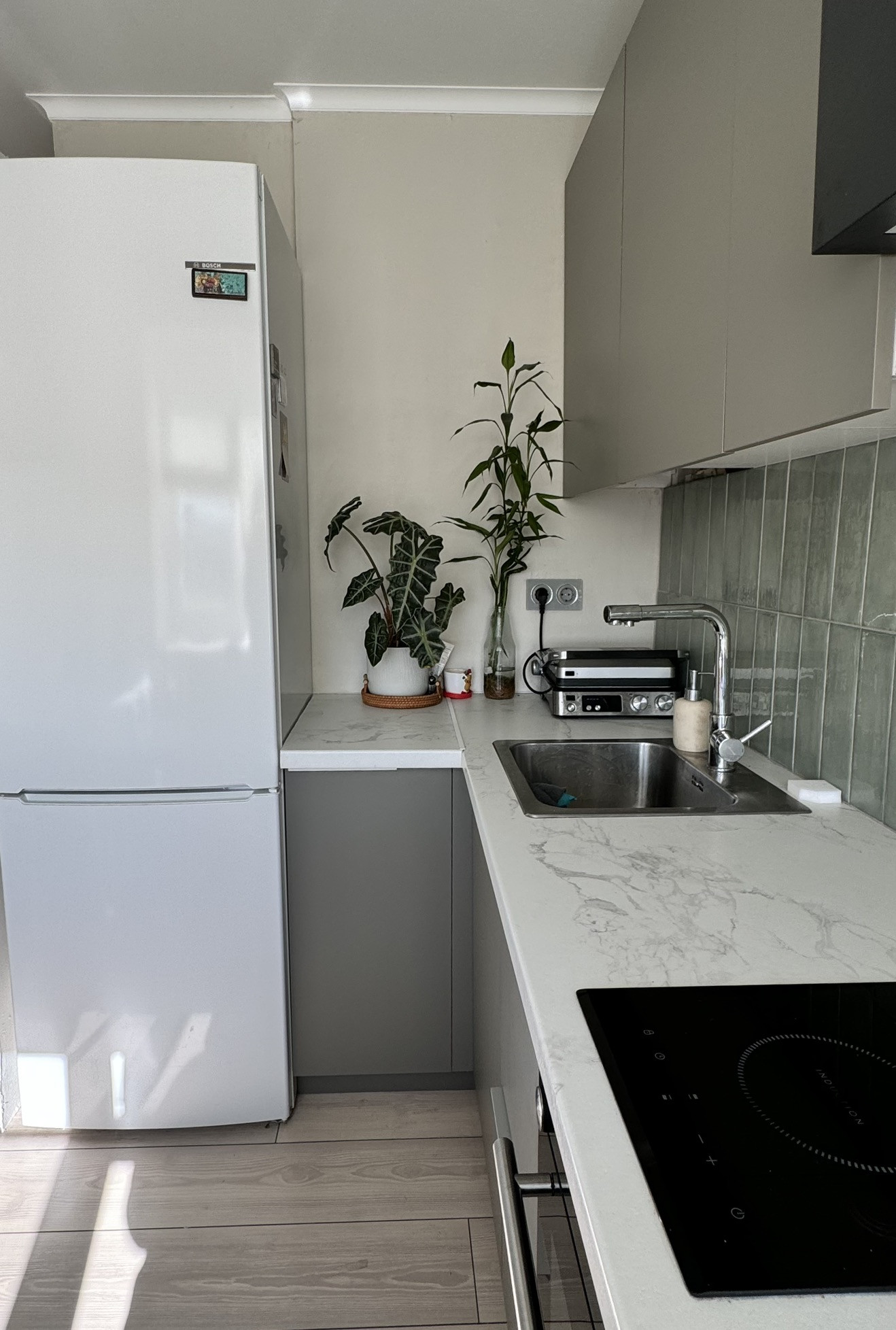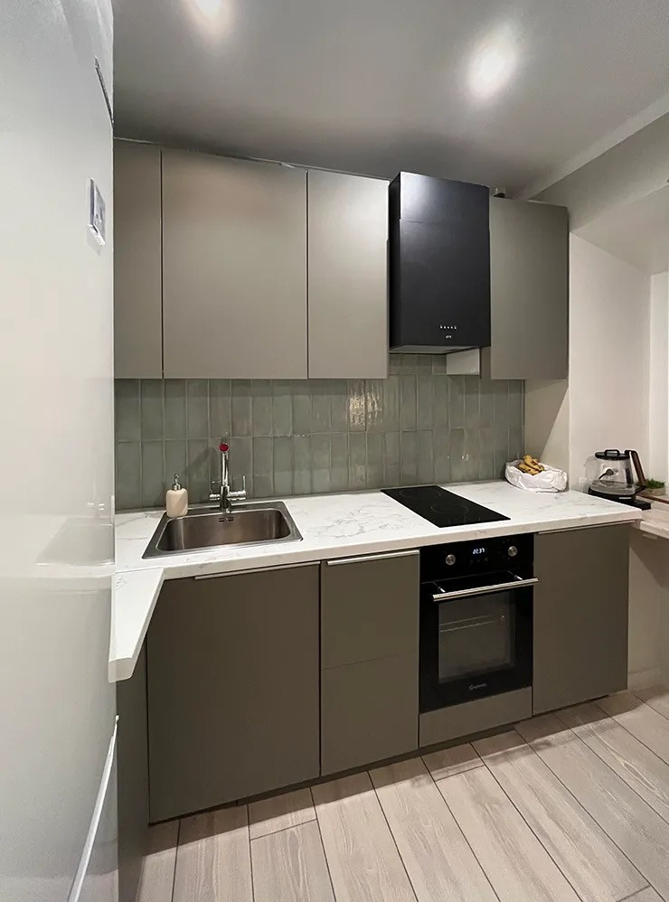 - Кухня со встроенной электродуховкой и инвертерной индукционной плитой. Установлена новая газовая колонка.
