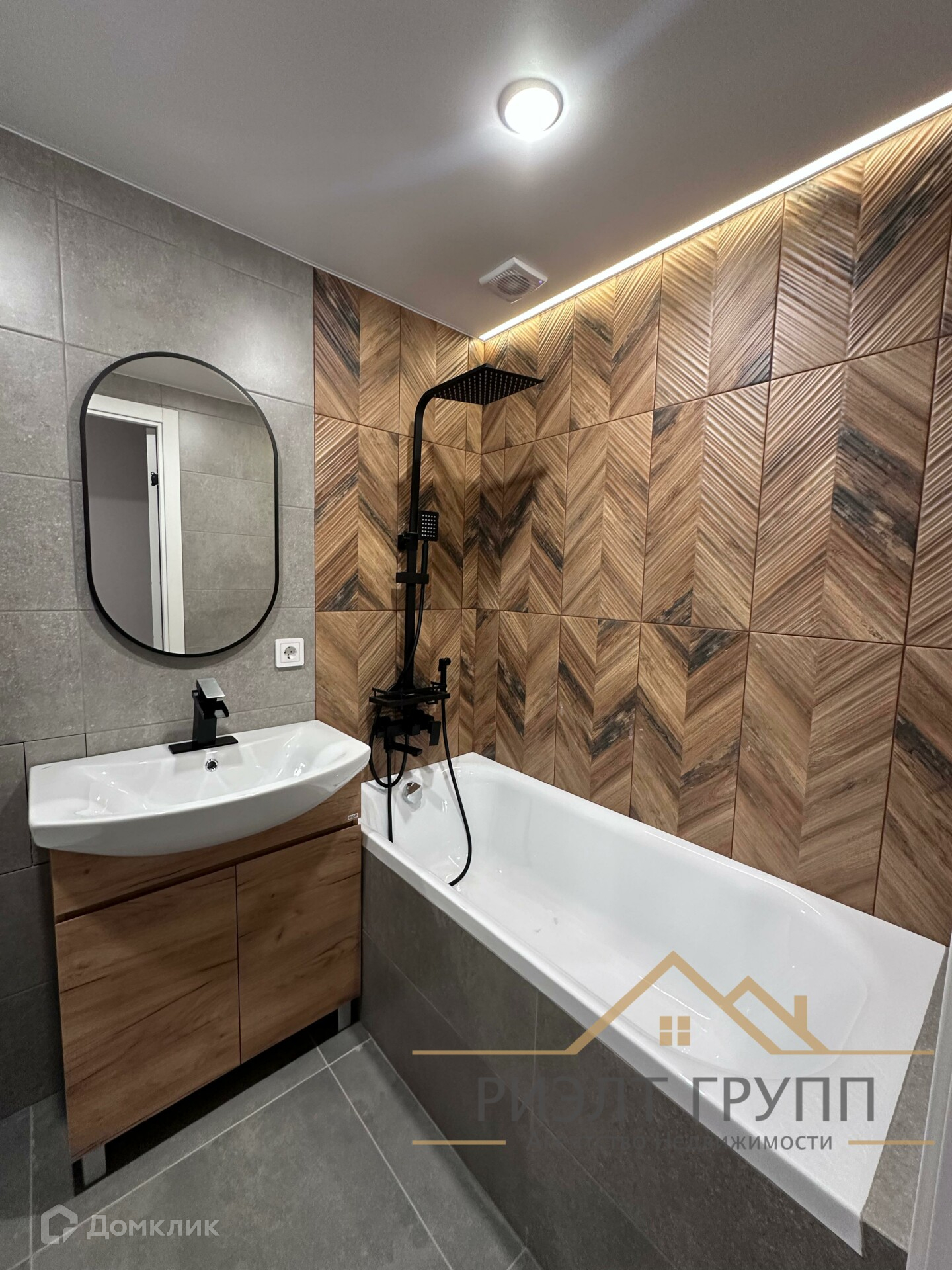 * Санузел в кафеле, большая ванная с декоративным смесителем с тропическим душем.