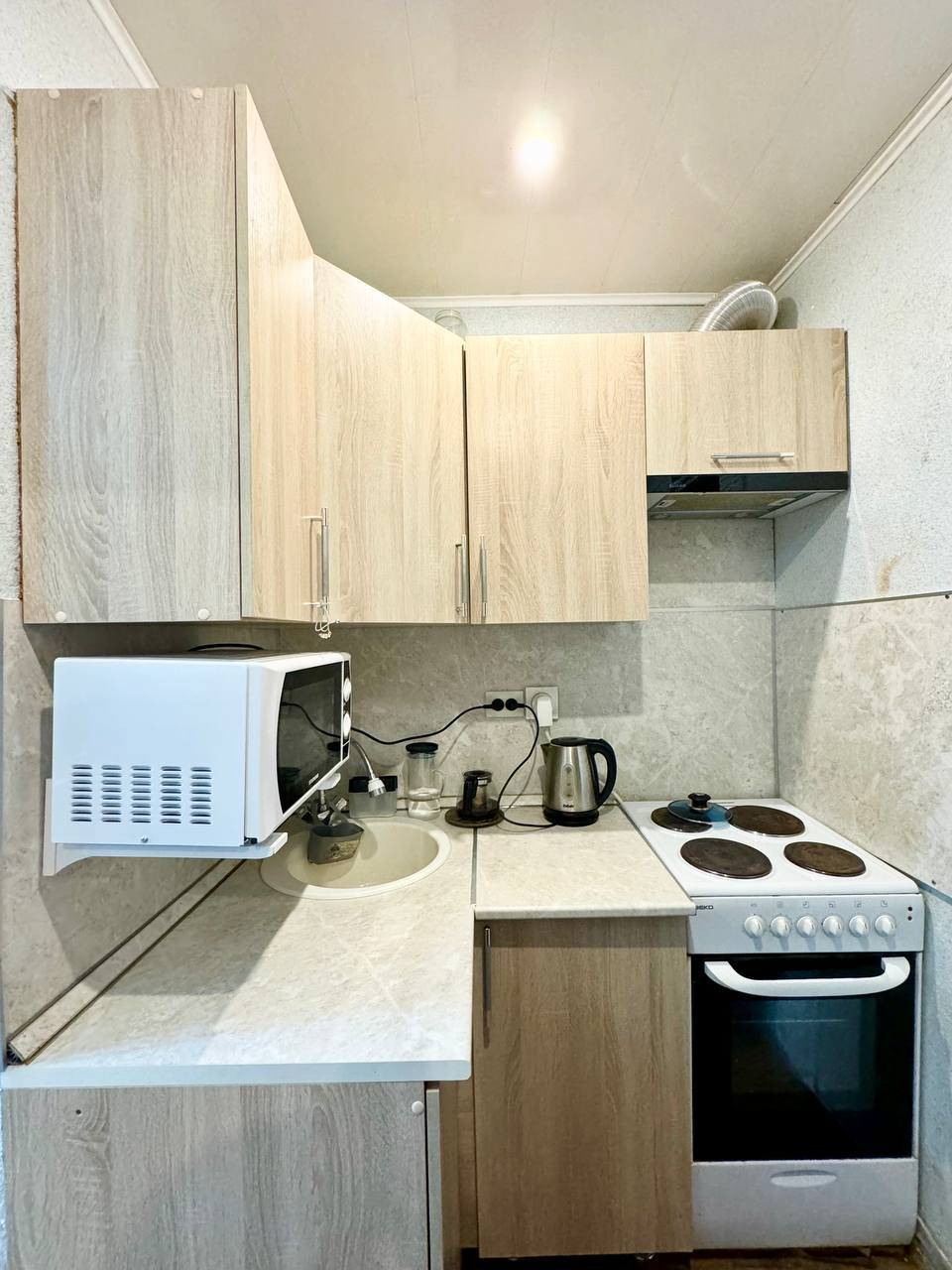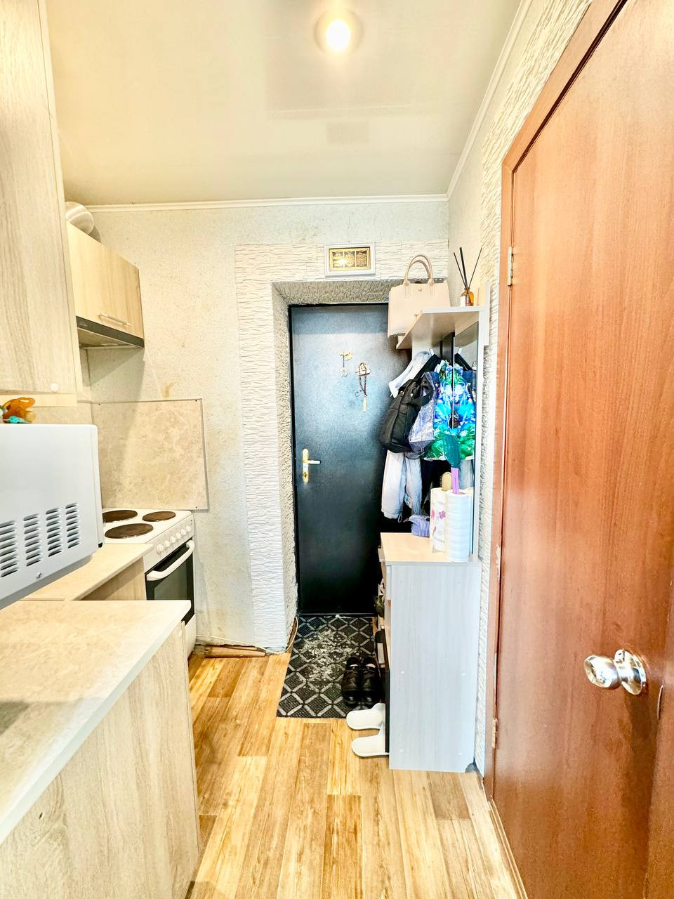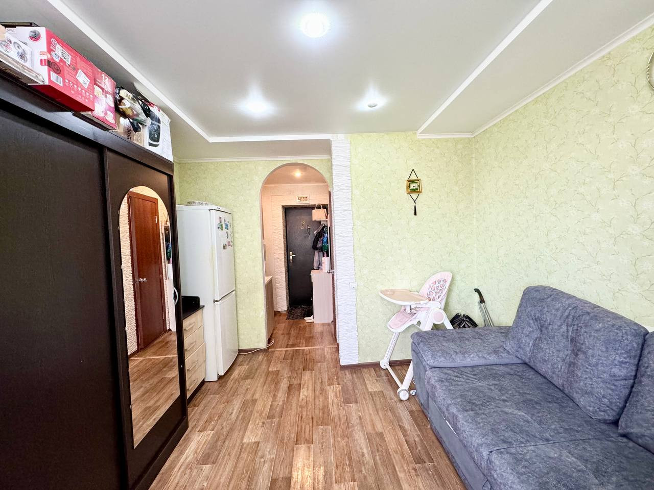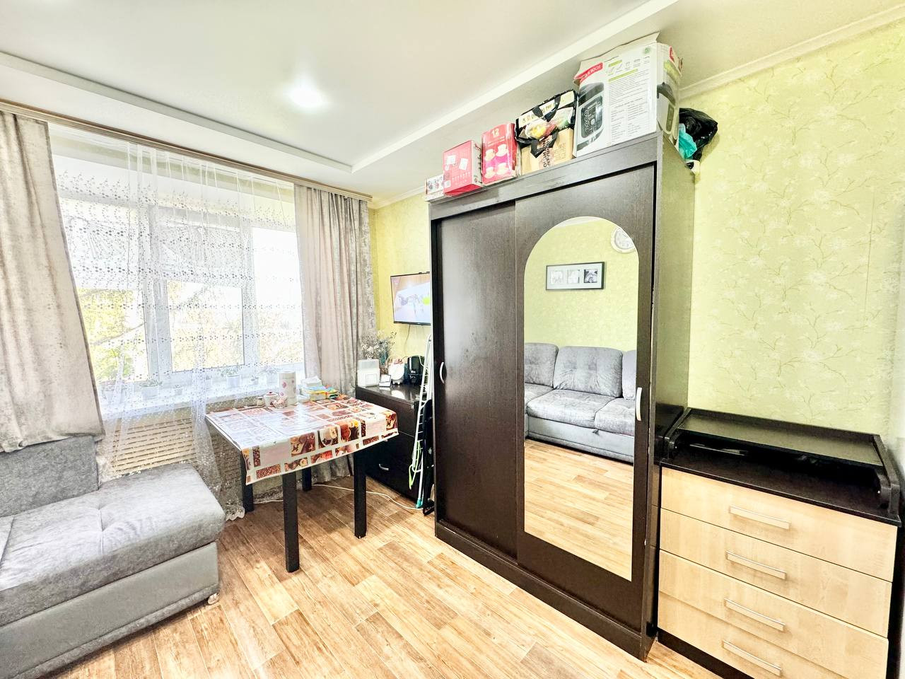 Уютная, светлая, теплая, не угловая комната cо статусом КВАРТИРЫ в кирпичном доме. Комната с ремонтом.  В комнате остаётся кухонный гарнитур, электрическая плита с духовкой, вытяжка, холодильник, шкаф купе, стиральная машина и кондиционер.