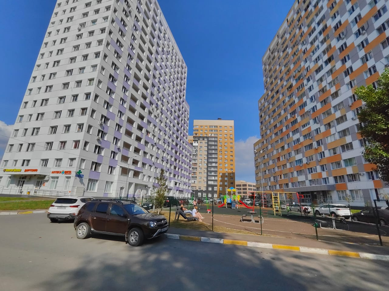 Во дворе огороженная детская площадка.