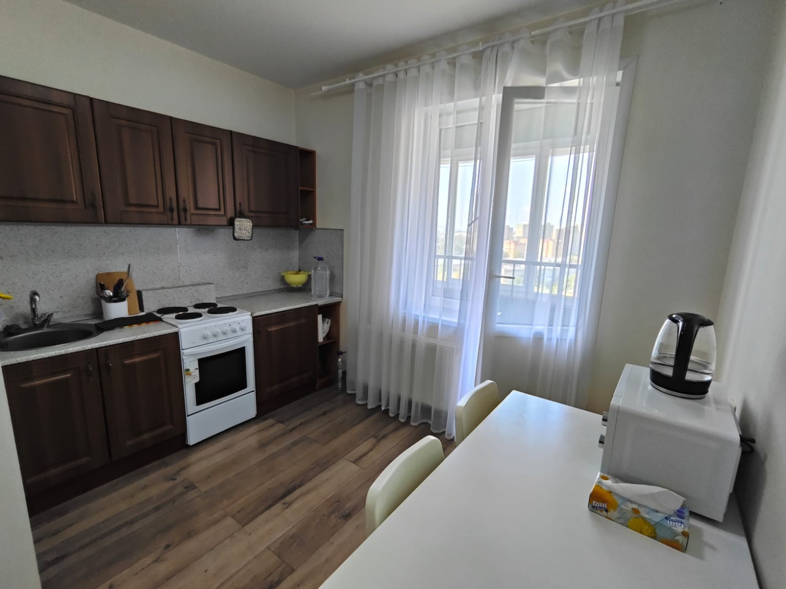 Очень светлая, красивый вид из окна.