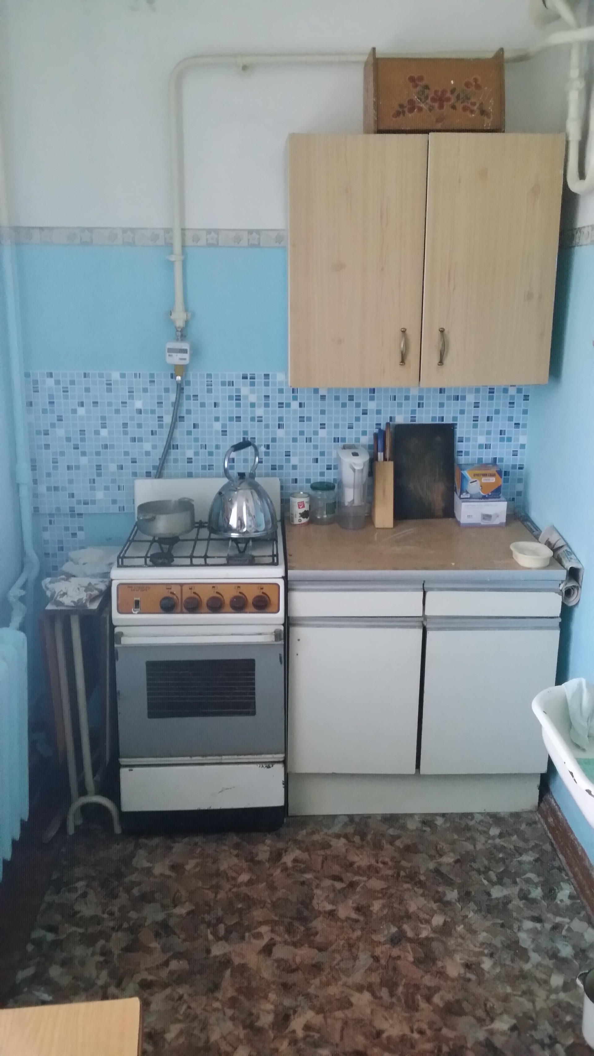 Квартира расположена на 1-м этаже, распашонка, жилая площадь около 19м2, кухня – 6м2, высокие потолки, санузел без плитки, установлена газовая колонка с электроподжигом и газ-контролем.
