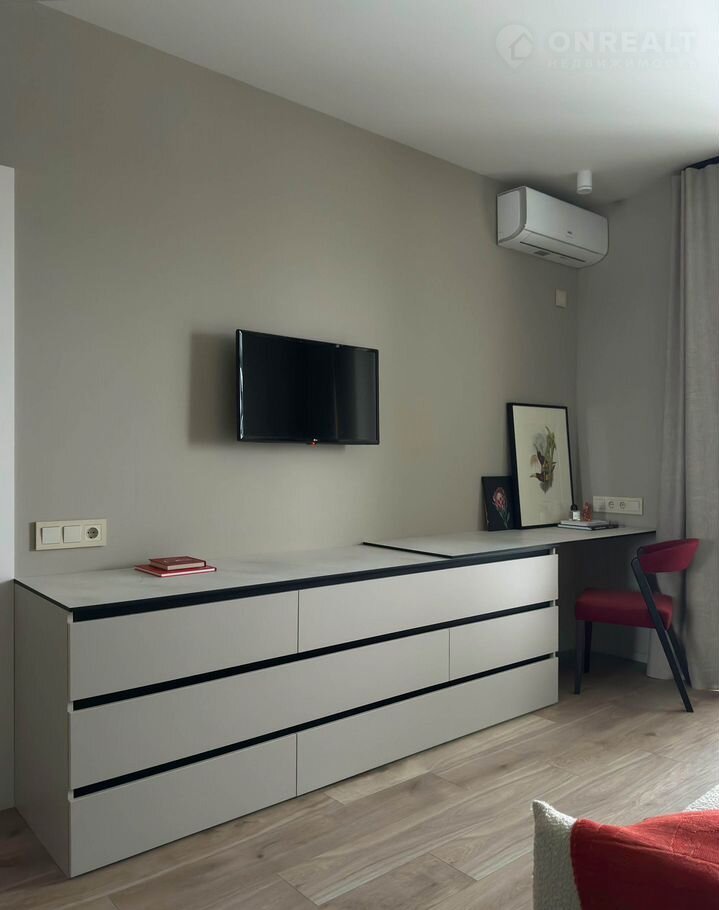 В комнате раскладывающийся ортопедический диван, комод, стол, телевизор, кондиционер.